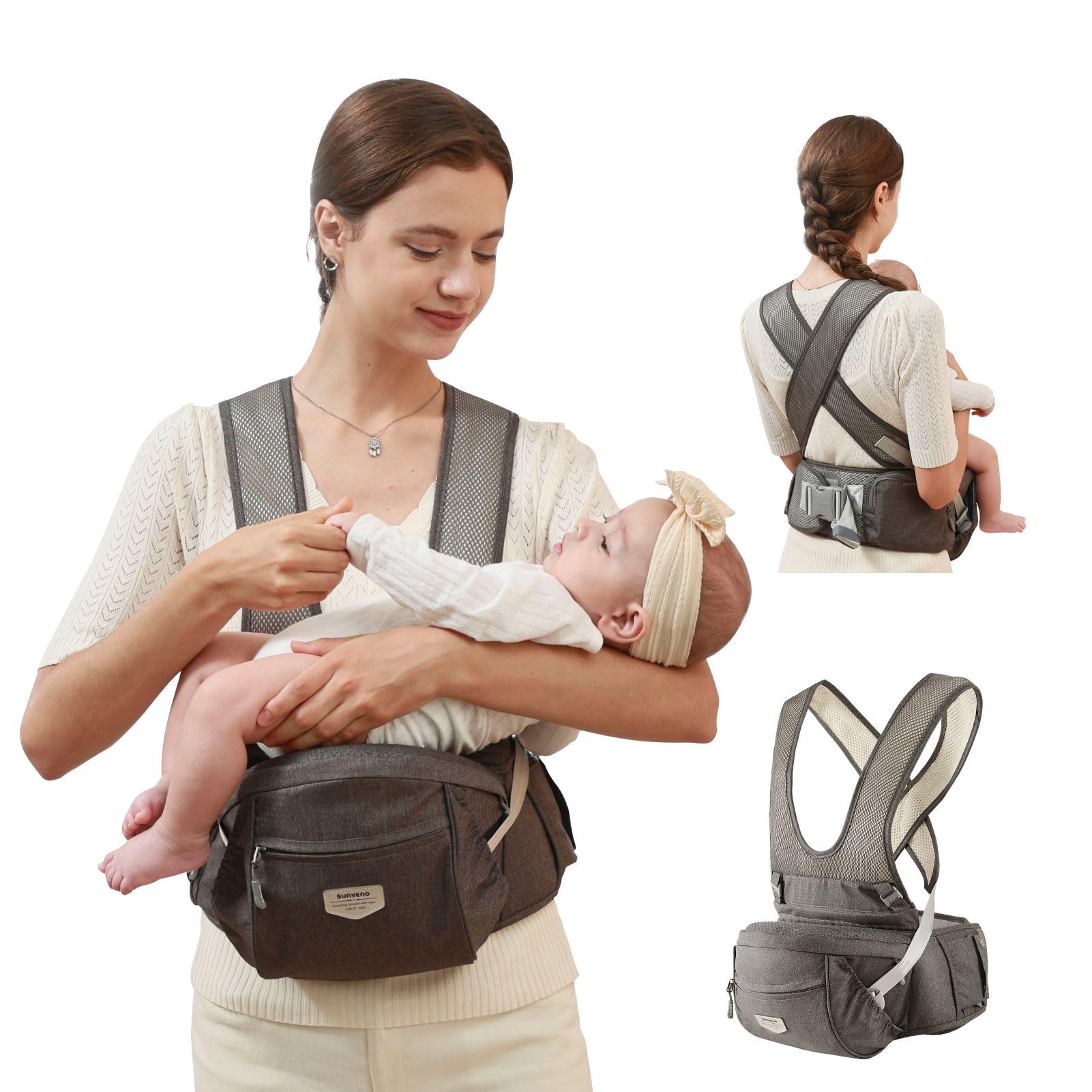 Sunveno Ergonomic Hip Seat Baby Carrier with Detachable Double Shoulder Straps, Waist & Back Relief, Breathable Mesh, Non-Slip Seat + Storage Pockets,|Baby & Toddler