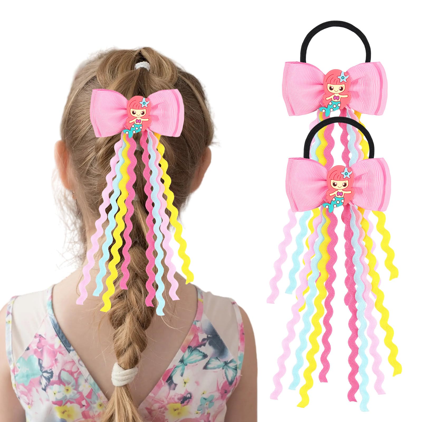 Usakinon® 2pcs 2.75" Mermaid Bows Ribbon Hair Tie with Elastic Rubber Bands with Wavy Streamers for Kids, Girls and Children, Colorful Hair|Baby & Toddler