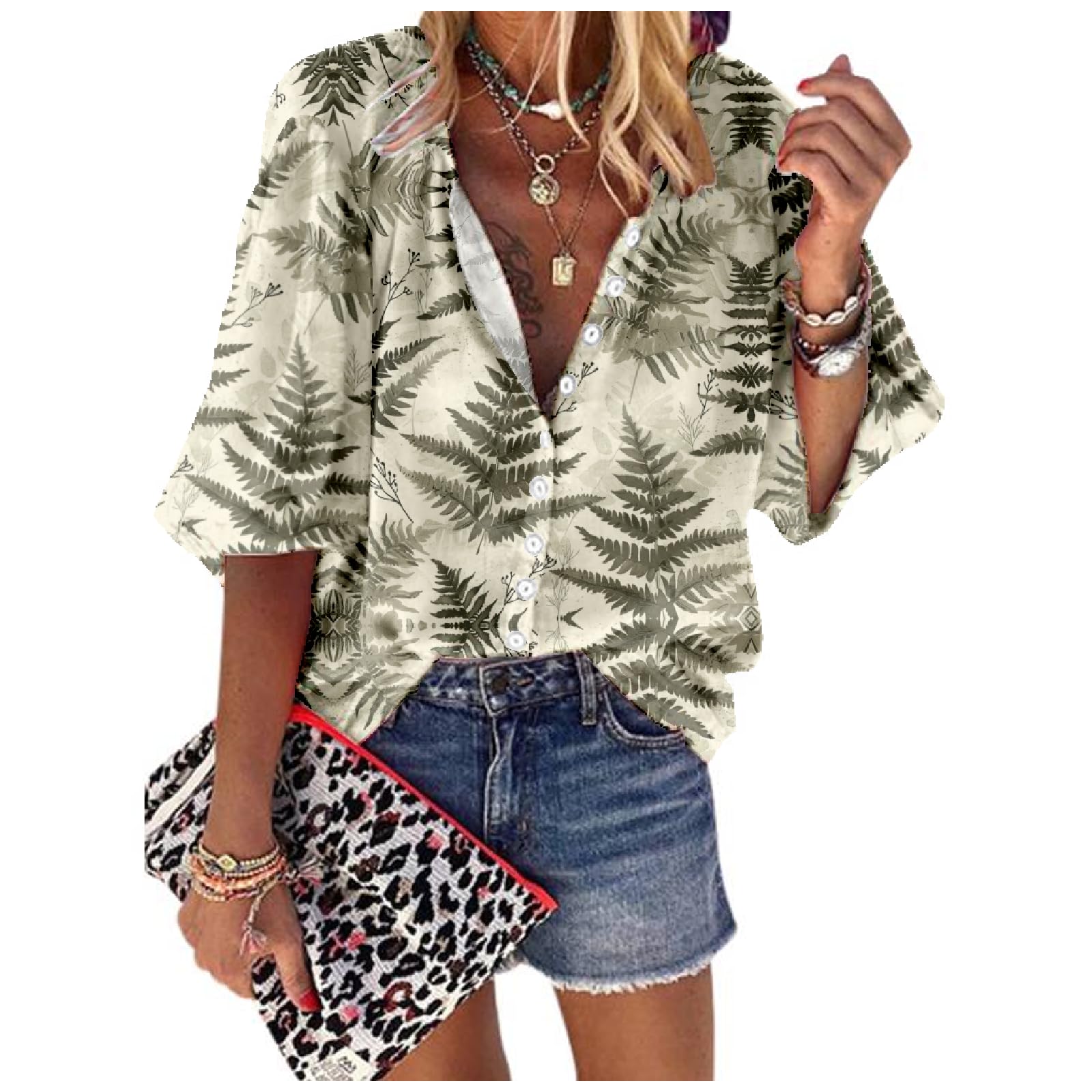 Biacolum Hawaiian Shirts for Women 3/4 Length Sleeve Womens Tops Linen Collared Casual Oversized Cotton Loose Fitted Plus Size Floral Button Down|Clothing