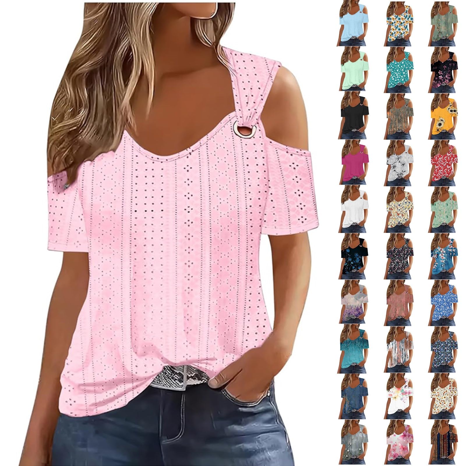 Sexy Cold Sholuder Tops for Women 2025 Summer Hollow Out Eyelet Short Sleeve Blouse Loose V Neck Tshirt Casual Tunics|Clothing