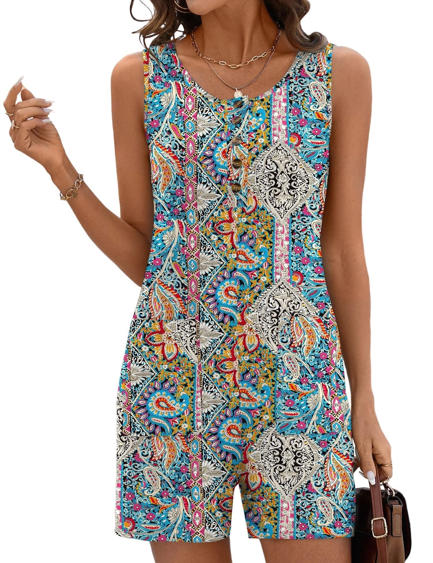 Rapbin Rompers for Women 2025 Summer Casual Sleeveless Scoop Neck Short Jumpsuits Loose Fit Button Overalls with Pockets|Clothing
