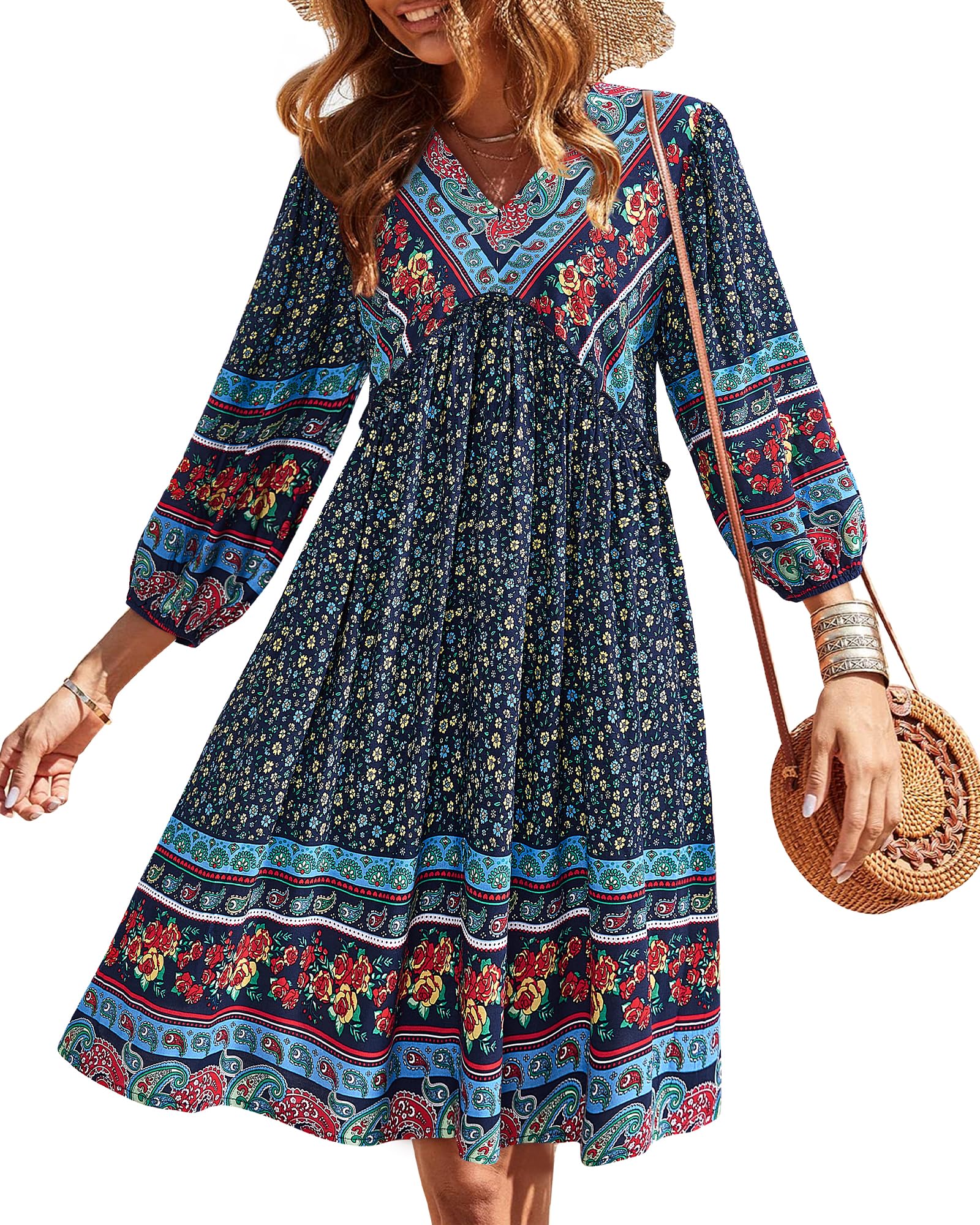 BTFBM Women Casual Spring Summer Dresses V Neck 3/4 Long Sleeve Ruffle Floral Flowy Boho Babydoll Mini Short Beach Dress|Clothing