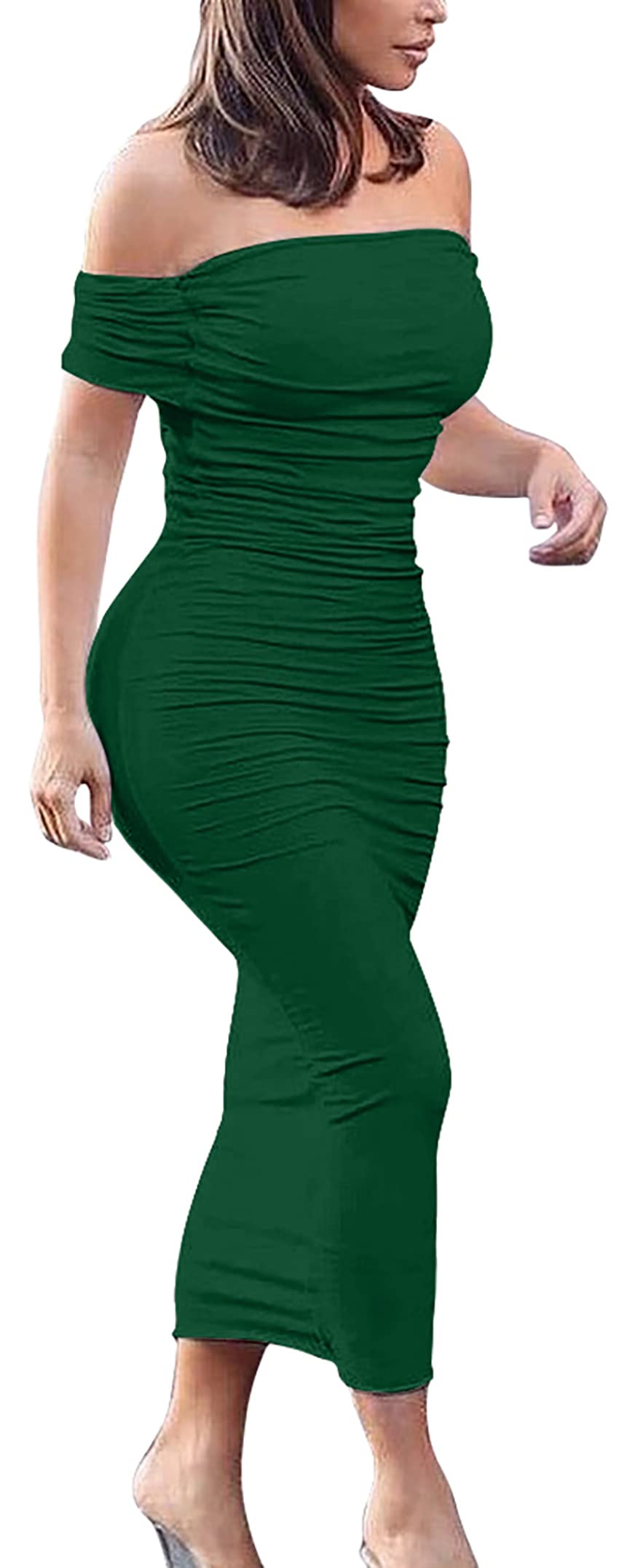 GOBLES Women's Ruched Off Shoulder Short Sleeve Bodycon Midi Elegant Cocktail Party Dress|Clothing