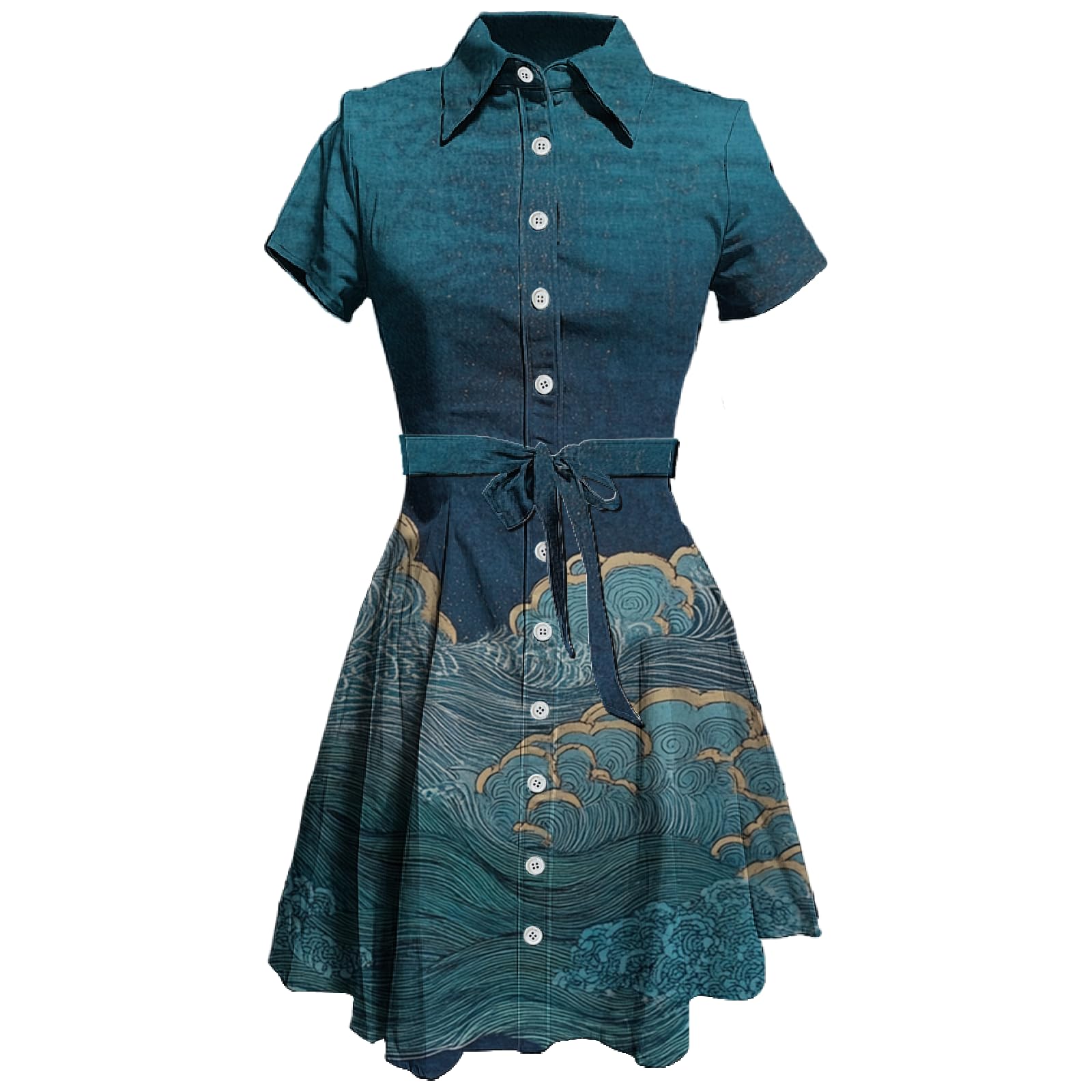 MARSVOVO Japanese Art Shirt Dresses for Women Short Sleeve Ruffle Button Down Tie Waist Trendy Elegant Midi Dress|Clothing