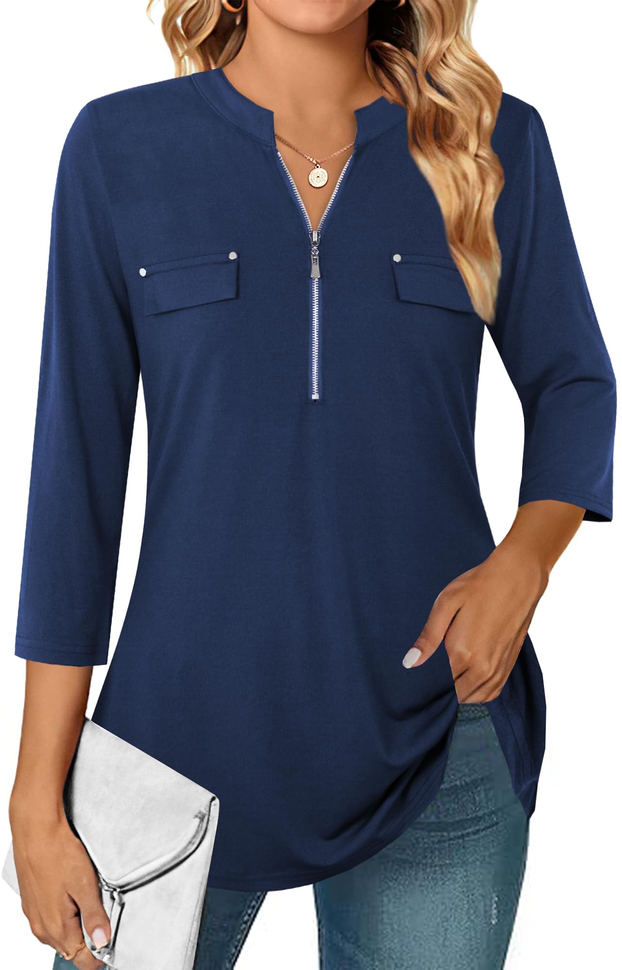 BEPEI Womens Floral 3/4 Sleeve Shirts Zip up V Neck Work Chiffon Blouses Top|Clothing