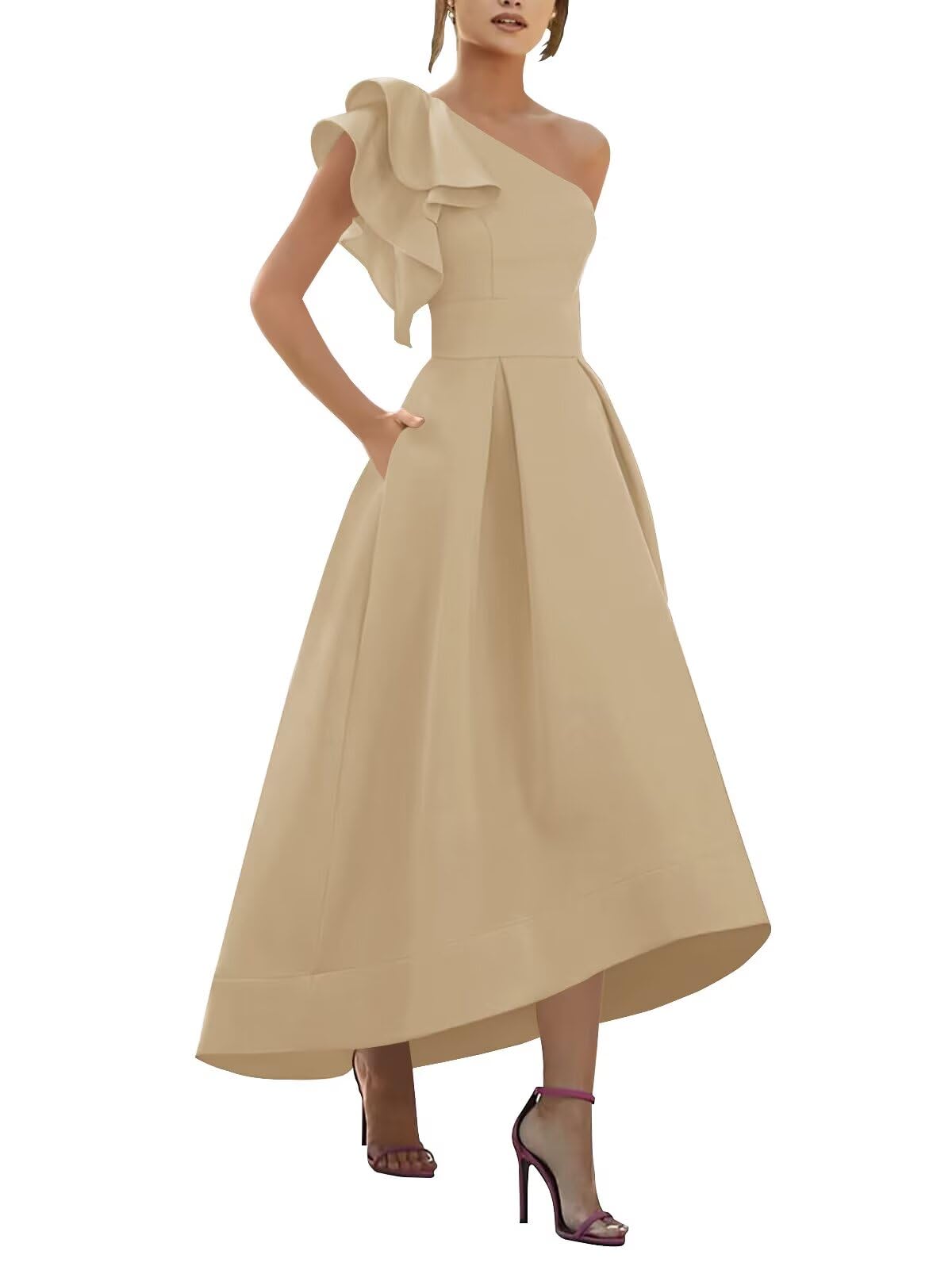 UZN Satin Mother of The Bride Dress One Shoulder Long Formal Wedding Guest Gown with Pockets|Clothing