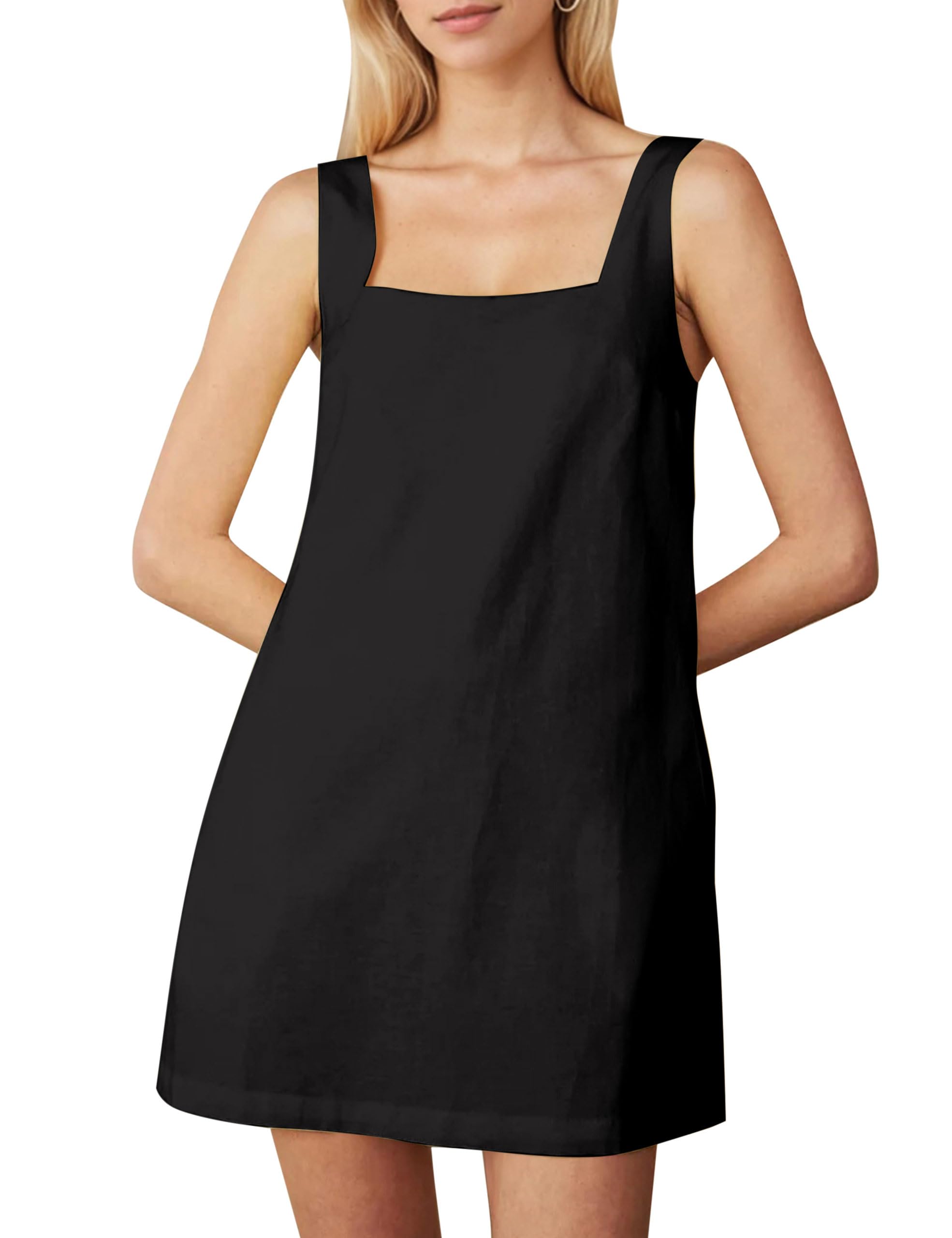 Soamat Womens Sleeveless Linen Mini Dress Casual Square Neck Backless Short Dresses Solid Summer Tank Shift Sundress with Pockets|Clothing