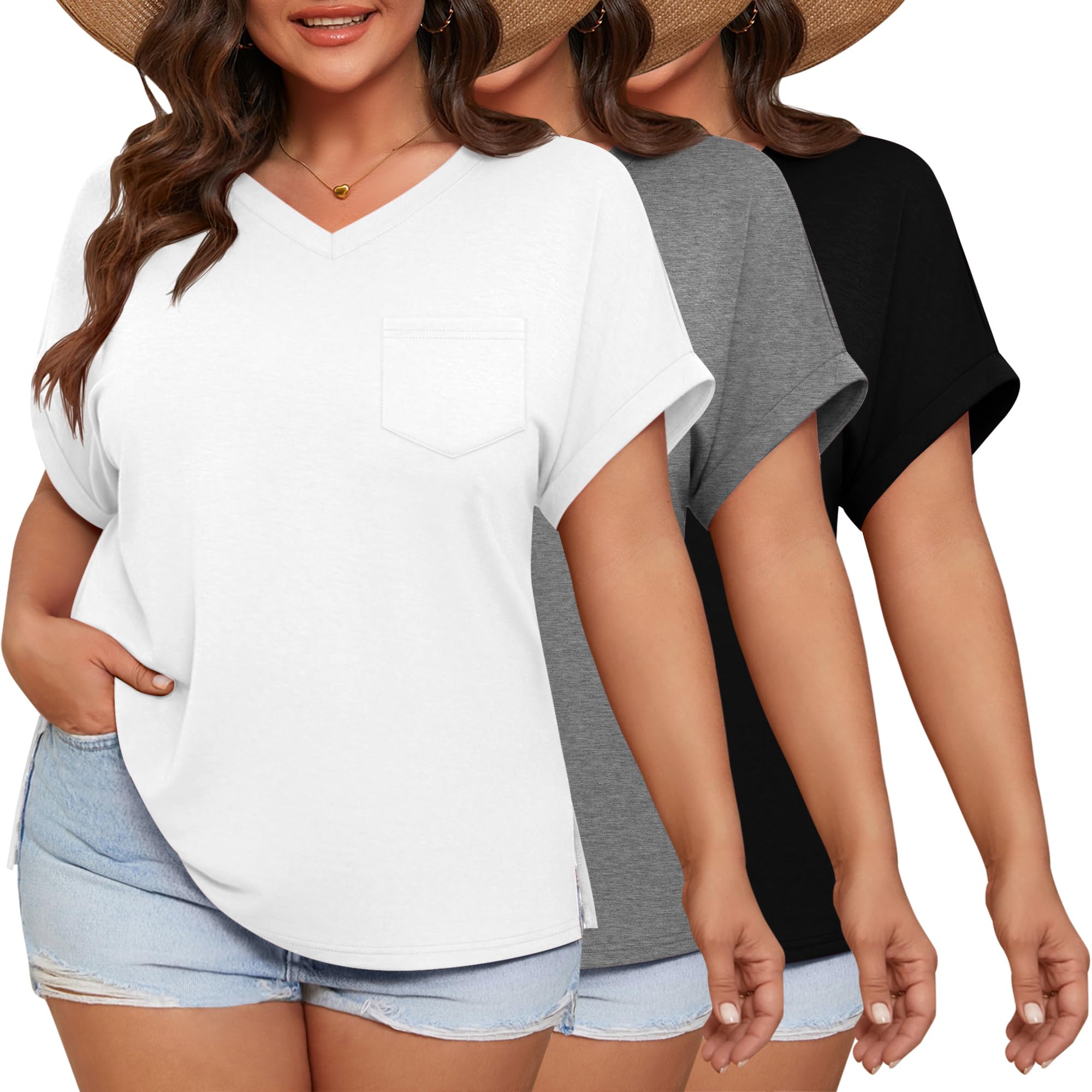 Ficerd 3 Pack Women's Plus Size T-Shirts, V Neck Short Sleeve Oversize Tunics Tops Sides Split Summer Loose Tees with Pockets|Clothing