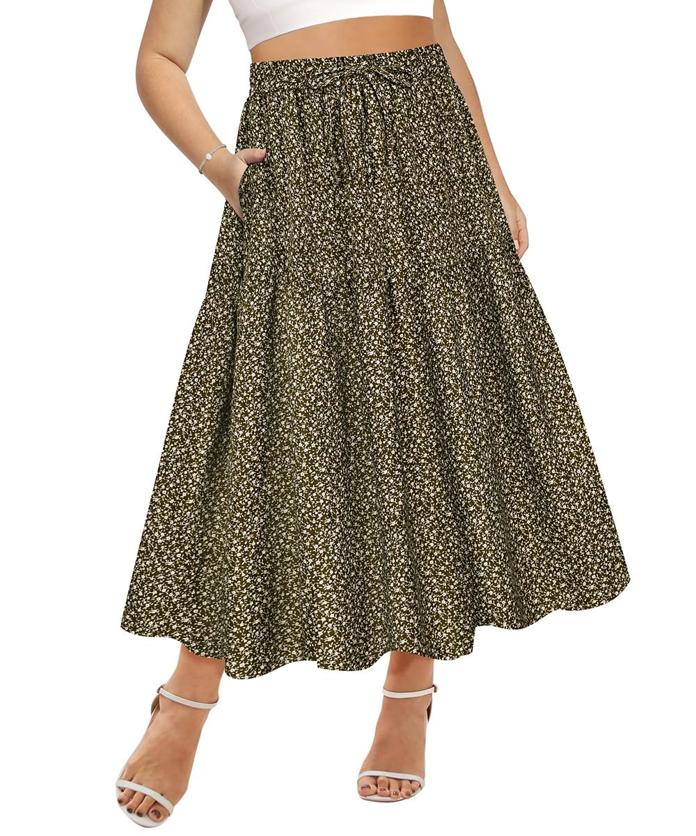 CARCOS Plus Size Skirts for Curvy Women Elastic High Waist Boho Maxi Skirt Pleated A-Line Tiered Long Skirts with Pockets|Clothing