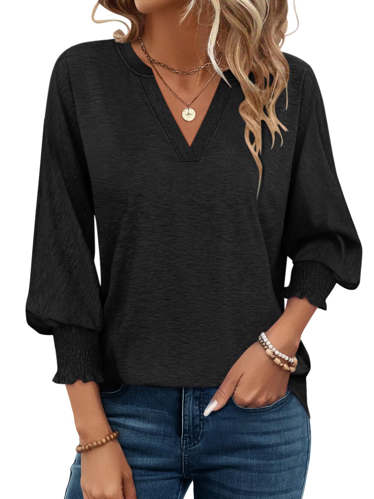 PGANDS Women's V Neck 3/4 Sleeve Tops Dressy Casual Shirts Cute Loose Blouse|Clothing
