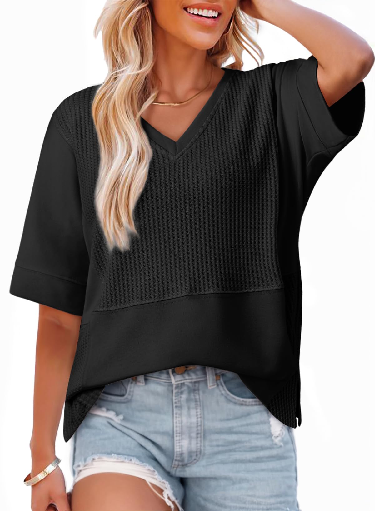 Dokotoo Oversized Tshirts for Women V-Neck Summer Tops Short Sleeve Fluffy Touch Waffle Casual Loose Fit Blouse|Clothing