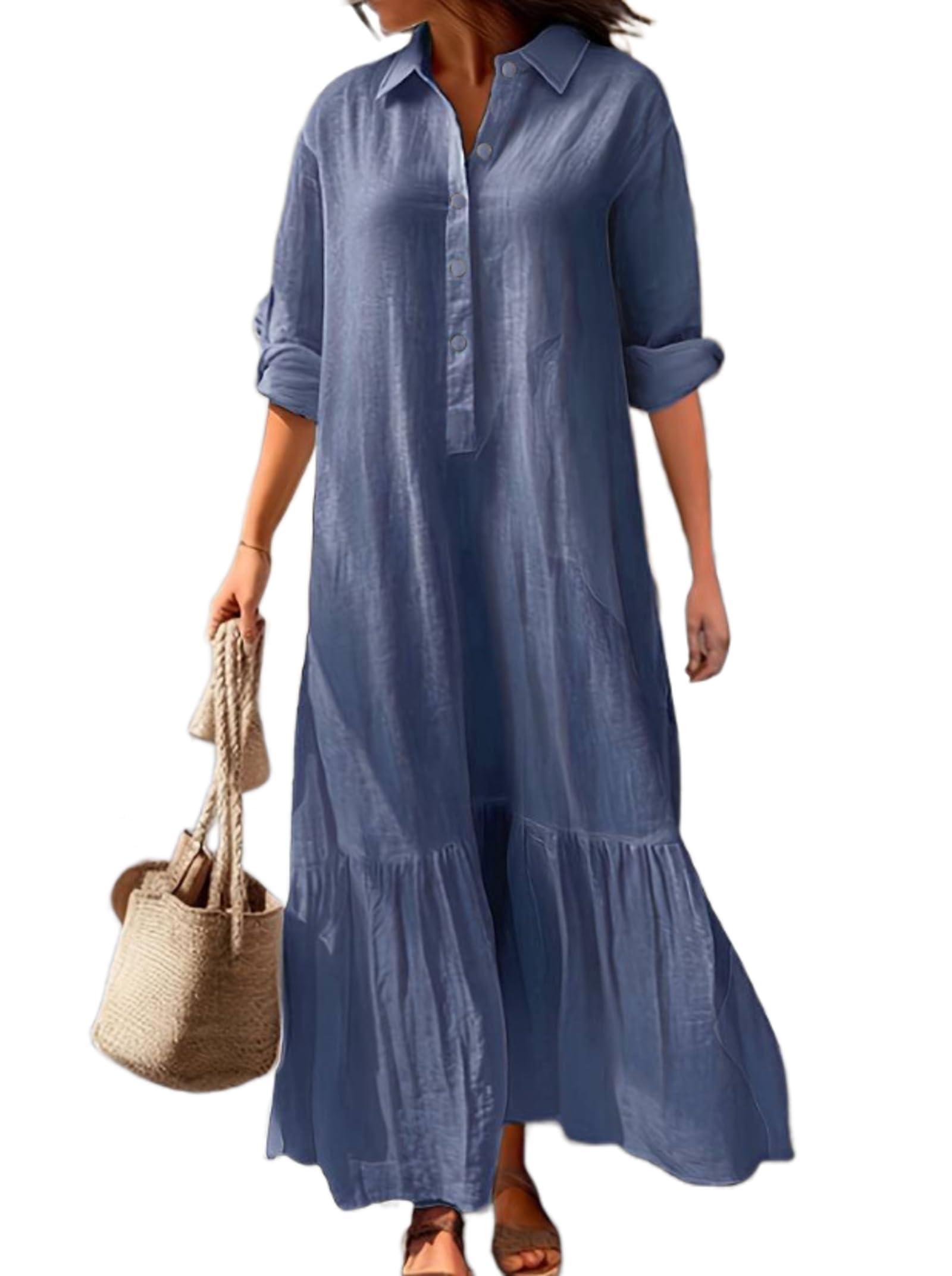 Bengbobar Women's Cotton Linen Maxi Dress Plus Size Casual Button Down Long Sleeve Flowy Lapel Collared Long Shirt Dress|Clothing