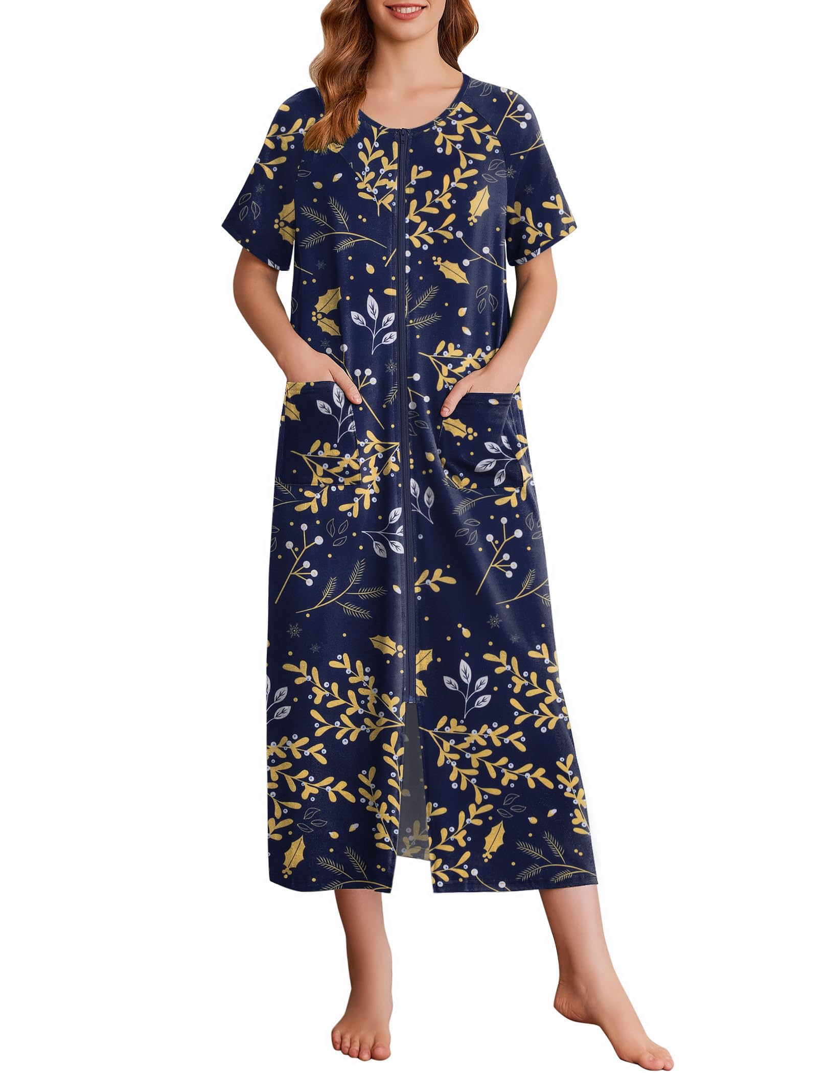 Ekouaer Women Long House Coat Zipper Front Robes Full Length Nightgowns with Pockets Striped Loungewear S-4XL|Clothing