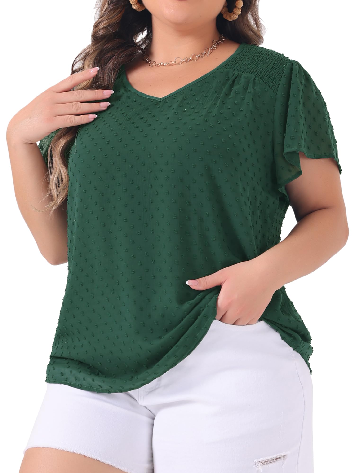 Agnes Orinda Plus Size Blouses for Women Summer Pin Dots Smocked Flare Sleeve Tops|Clothing