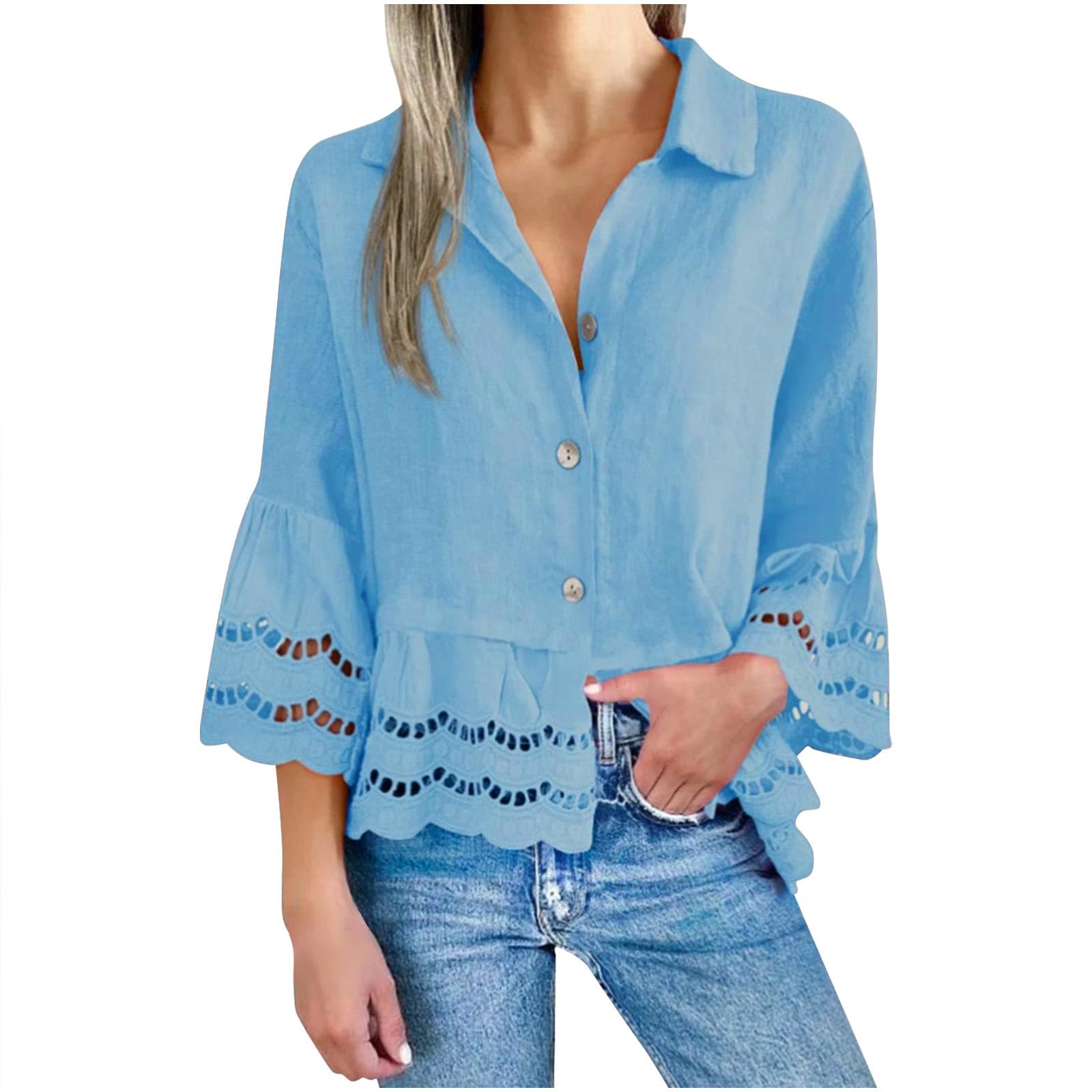Women's 3/4 Bell Sleeve Button Down Shirt V-Neck Lace Hollow Out Blouse Casual Loose Fit Ruffle Hem Eyelet Work Tops|Clothing