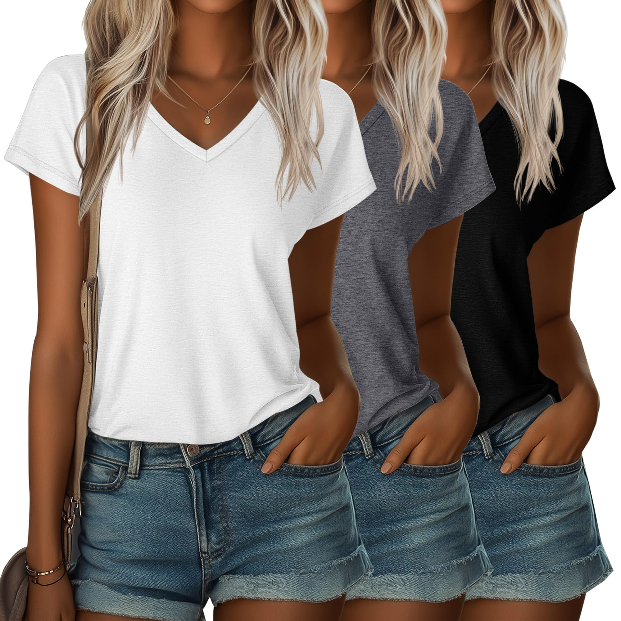 Ficerd 3 Pack Women's V Neck T Shirts Cap Sleeve Top for Summer Causal Short Sleeve 2025 Trendy Basic Tees|Clothing