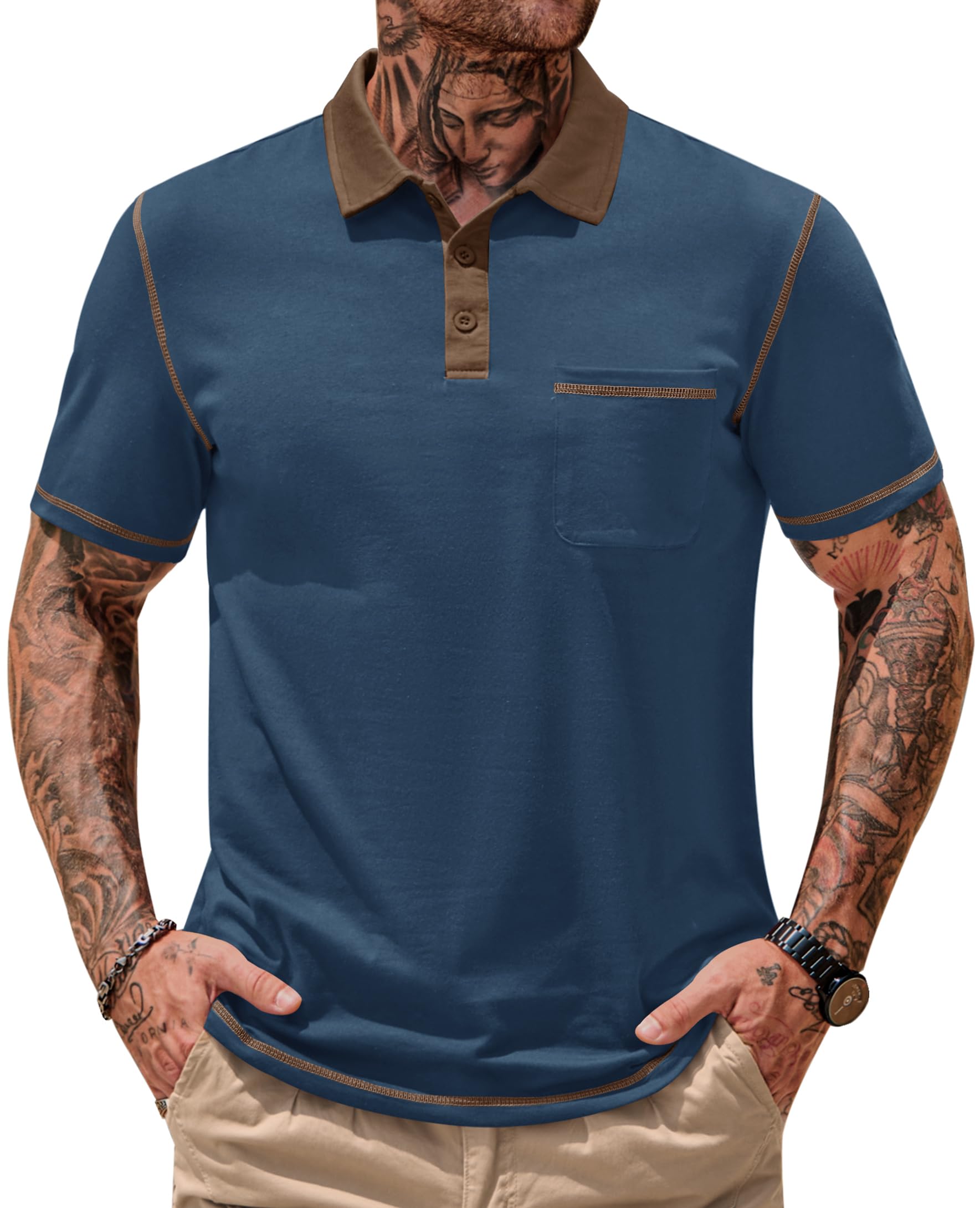 VOGSTART Mens Polo Shirts Casual Color Block Collar Short Sleeve Shirt with Pocket (S-XXL)|Clothing