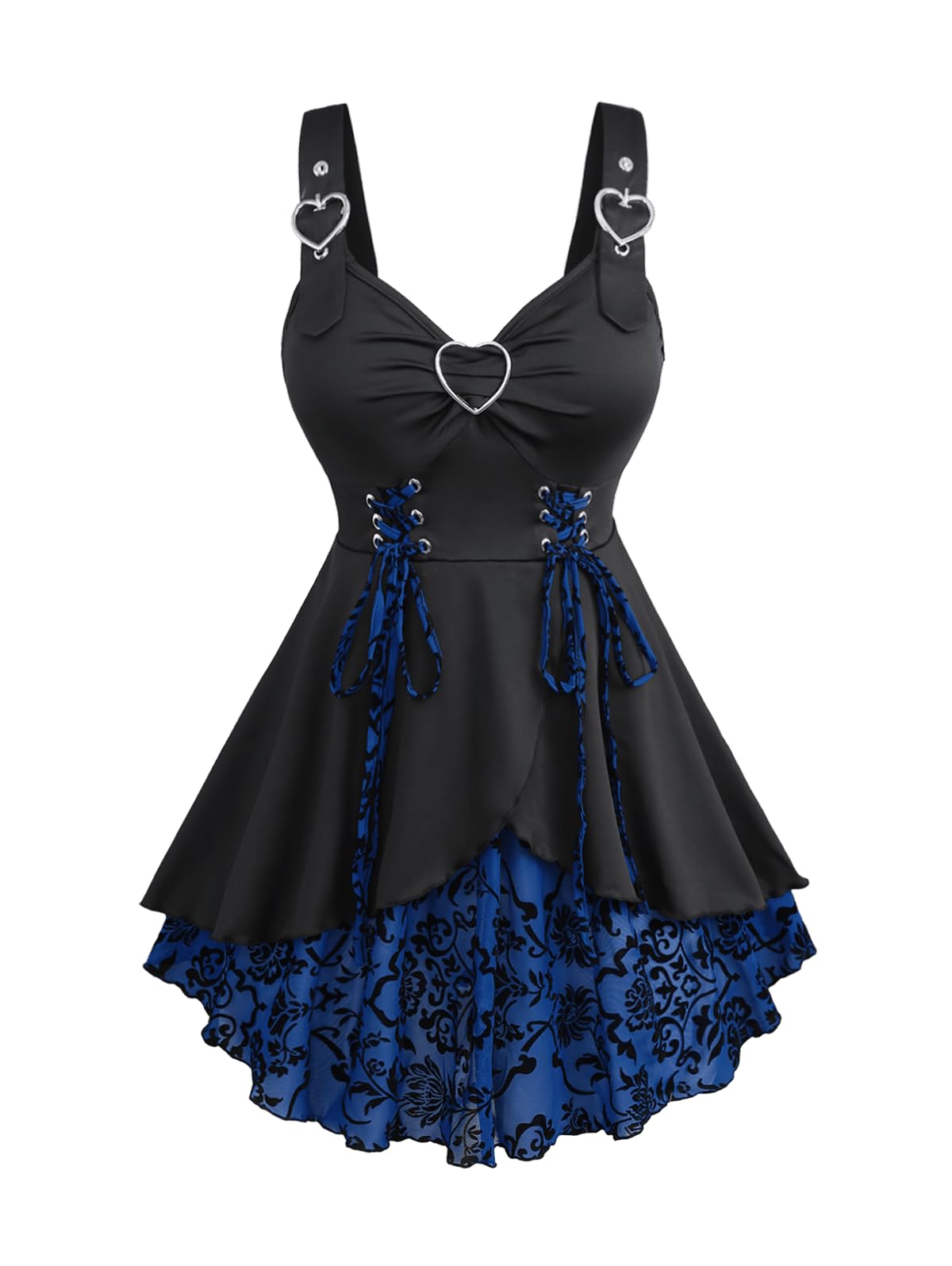 ROSE GAL Womens Plus Size Floral Flocking Tulip Hem Layered Ruffles Lace Up Ruched Heart Buckles Gothic Tank Top|Clothing
