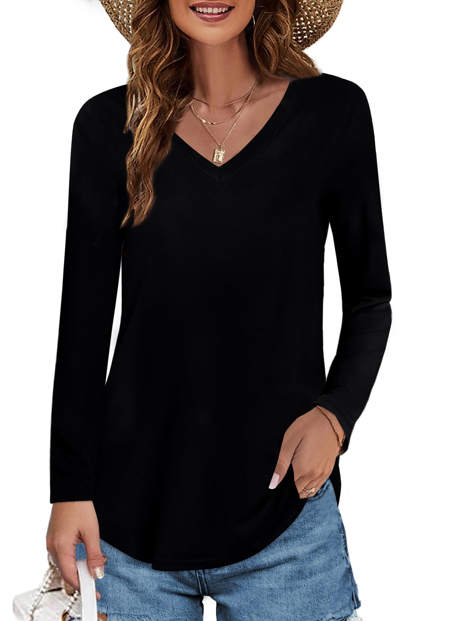 Elesomo Womens T Shirts V Neck Summer Short/Long Sleeve Cotton Tops Tees|Clothing