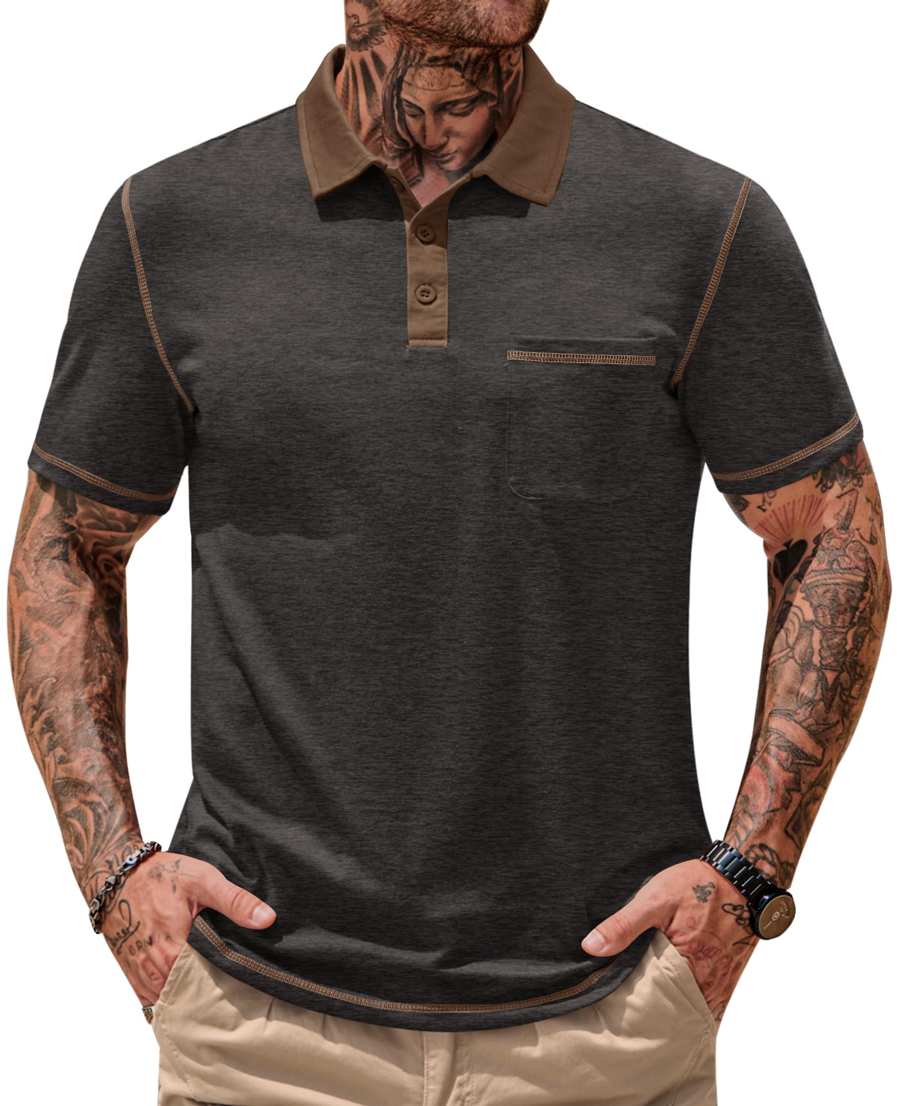 VOGSTART Mens Polo Shirts Casual Color Block Collar Short Sleeve Shirt with Pocket (S-XXL)|Clothing