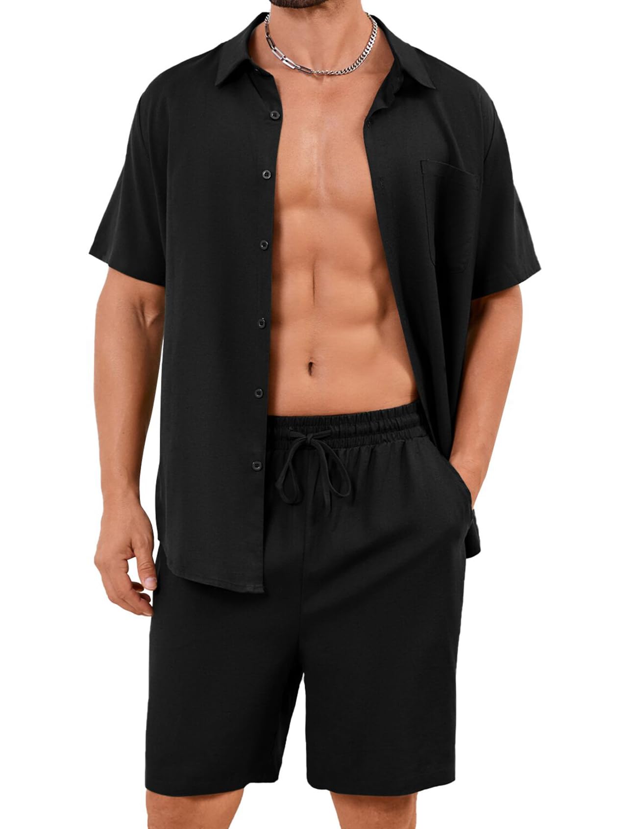 Flygo Men Cotton Linen Sets Outfits 2 Piece Summer Short Sleeve Shirt and Shorts Set Beach Wear Vacation Outfit|Clothing