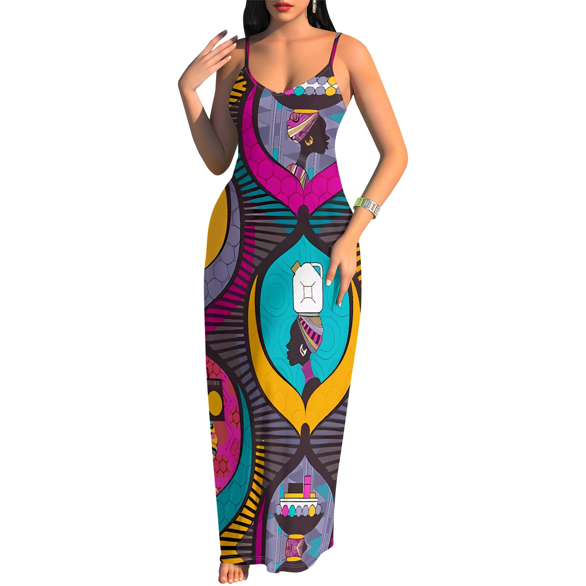 Women's Summer Maxi Dress Casual African Print Spaghetti Strap Long Maxi Dresses Sexy V-Neck Floral Sleeveless Beach Sundress|Clothing