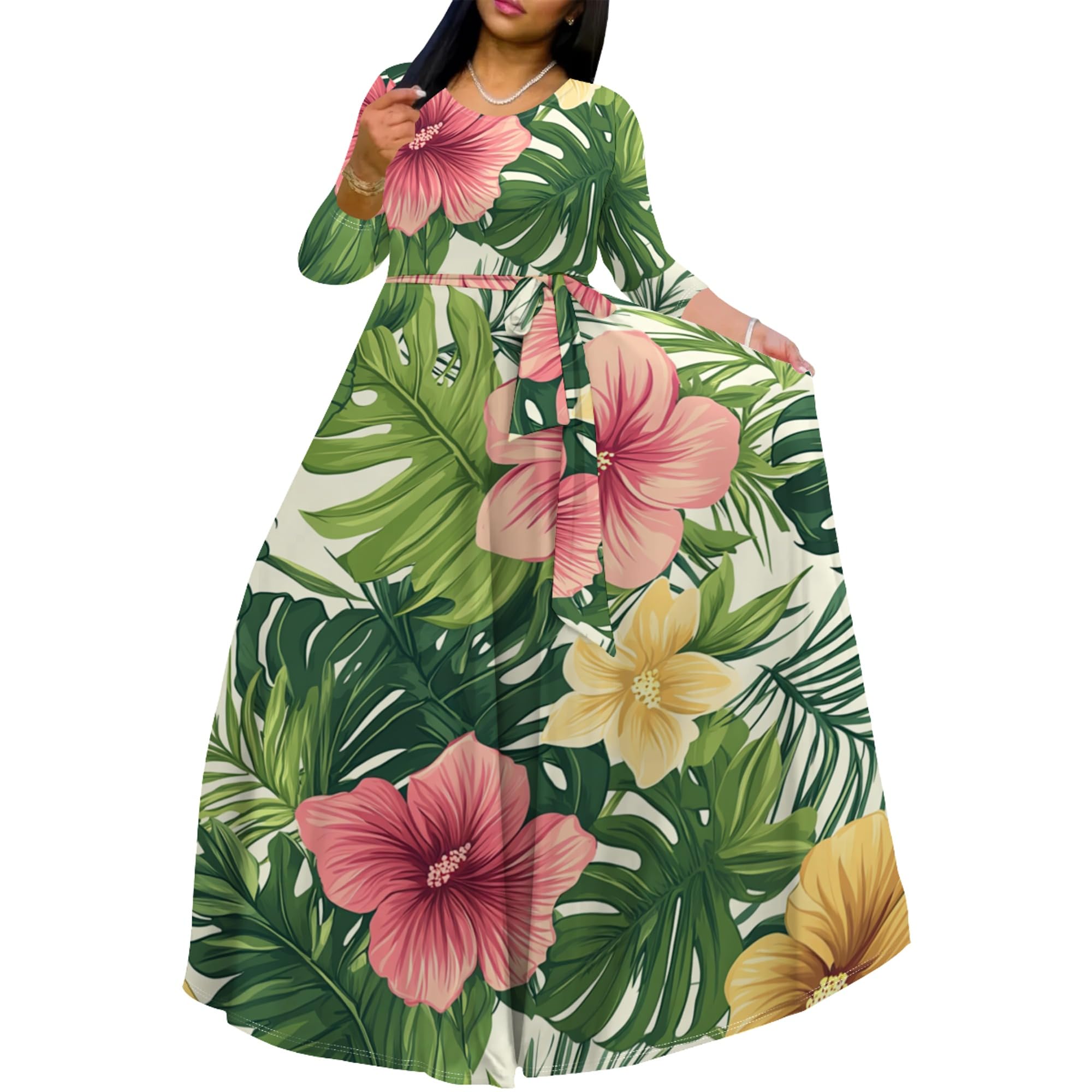 Shamankadi Womens Hawaiian Print Dress 3/4 Sleeve Crewneck Fall Casual Flowy Maxi Dresses with Belt|Clothing