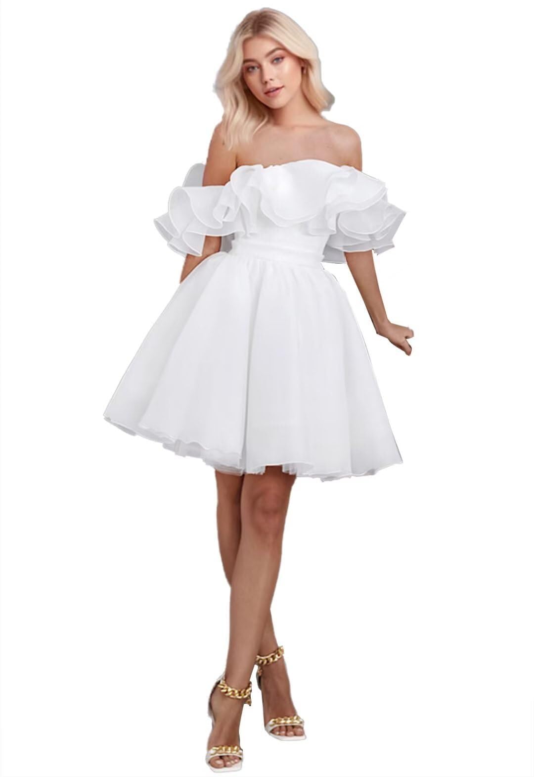 Absyore Womens Off Shoulder Tulle Short Bridal Dresses A Line Wedding Reception Gown for Bride White Elopement Dress 14|Clothing
