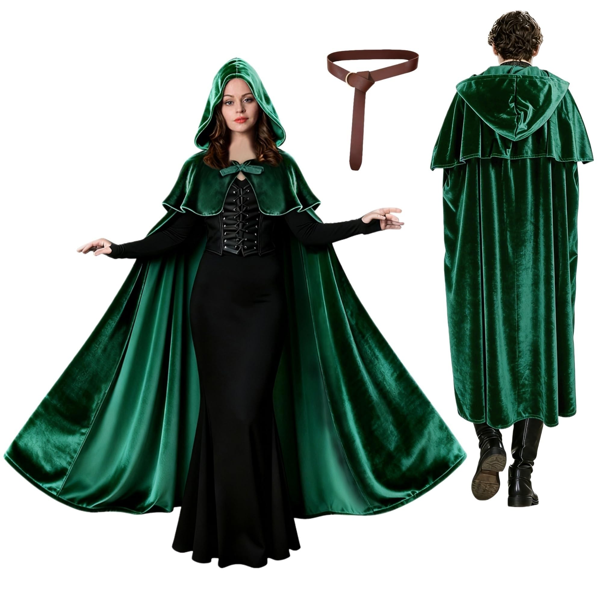 Niurui Renaissance Hooded Cape with Vintage Belt Medieval Cloak for Women and Men Hobbit Halloween Costume|Clothing