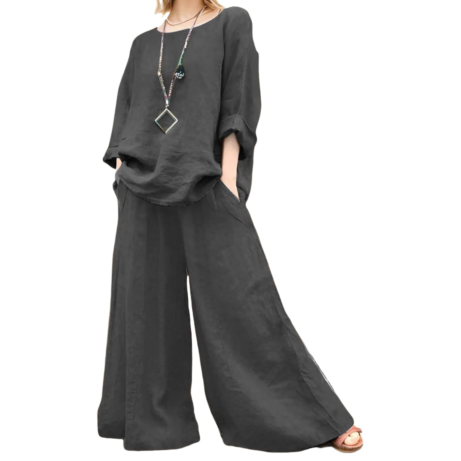 Linen Set for Women 2 Piece Summer Outfits Oversized Short Sleeve Tops and Wide Leg Pants Tracksuit Lounge Sets|Clothing