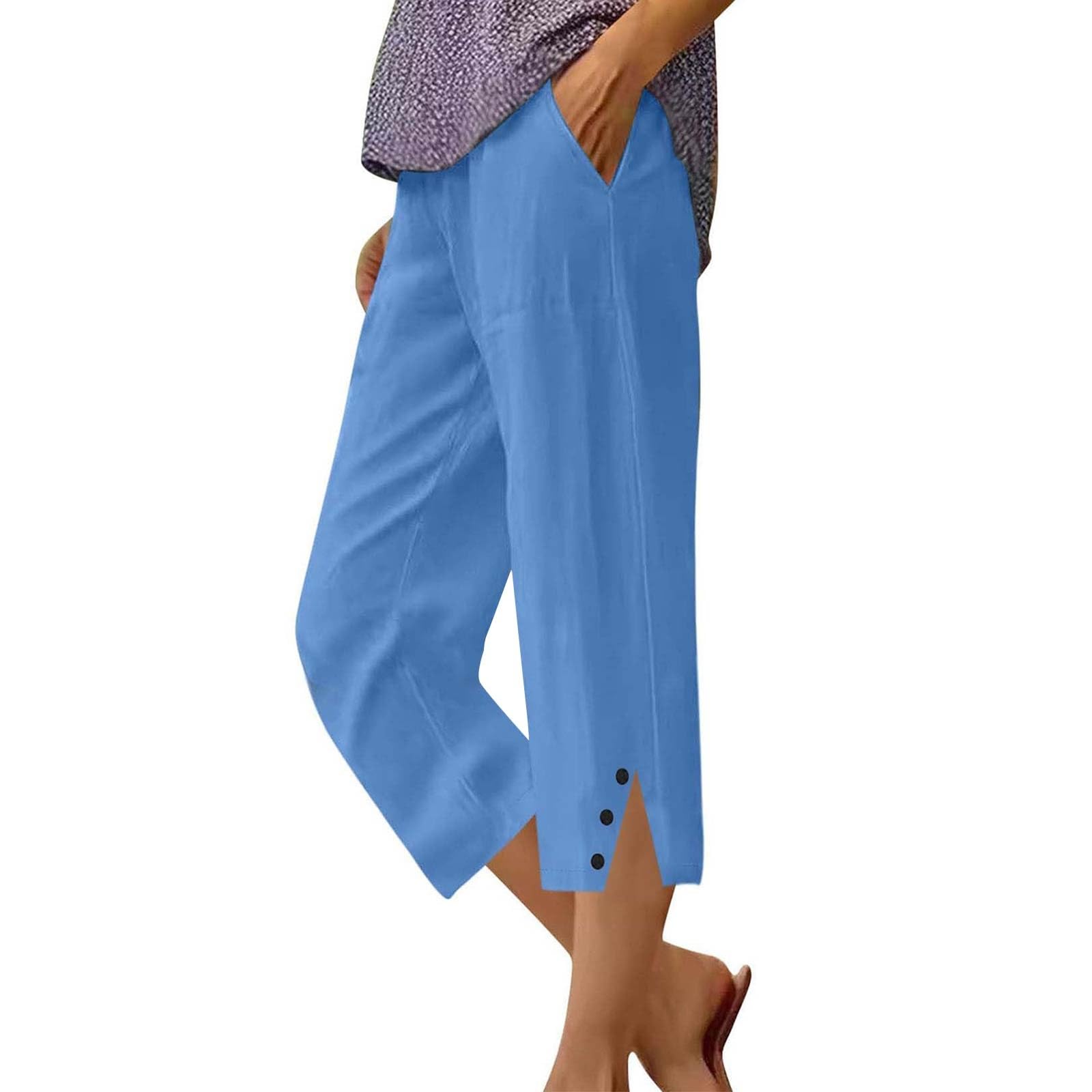 Straight Leg Pants Women Lightweight Summer Cotton Linen Cropped Pants Casual Side Slit Lounge Pant with Pockets|Clothing