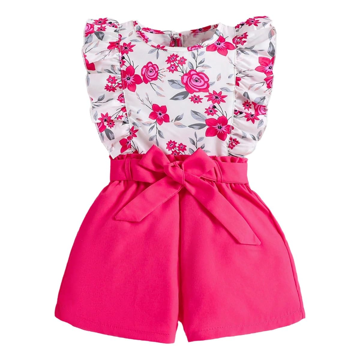 KIDLAGA Kids Toddler Girls Clothes Outfits Floral Print Ruffle Sleeveless Top Belted Shorts Set Summer Clothing Set|Clothing