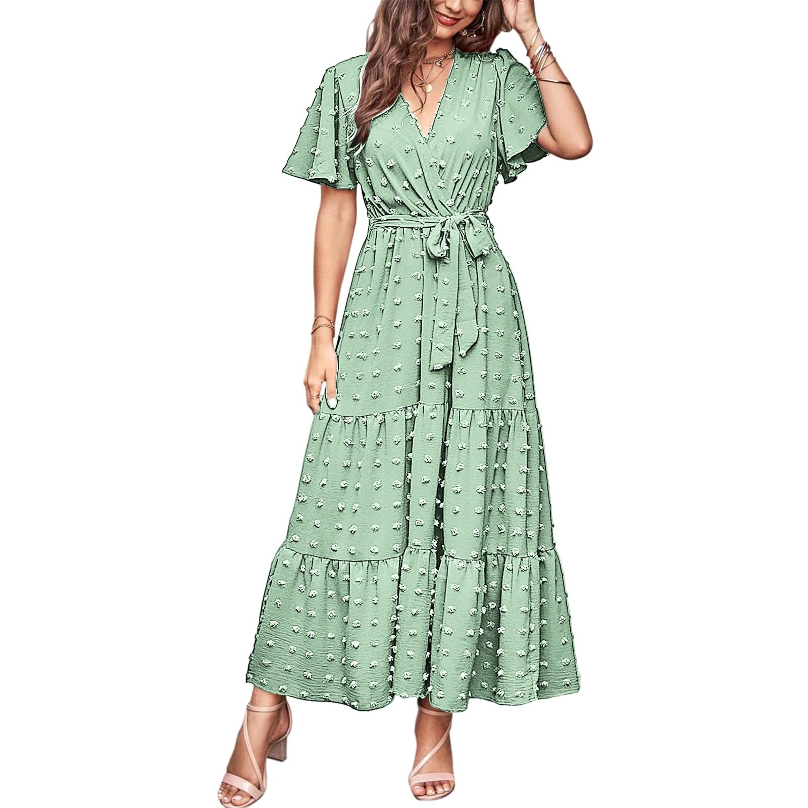 Womens Boho Swiss Dot Maxi Dresses Fashion 2025 V Neck Short Sleeve Ruffle Tiered Flowy Long Dresses with Belt|Clothing