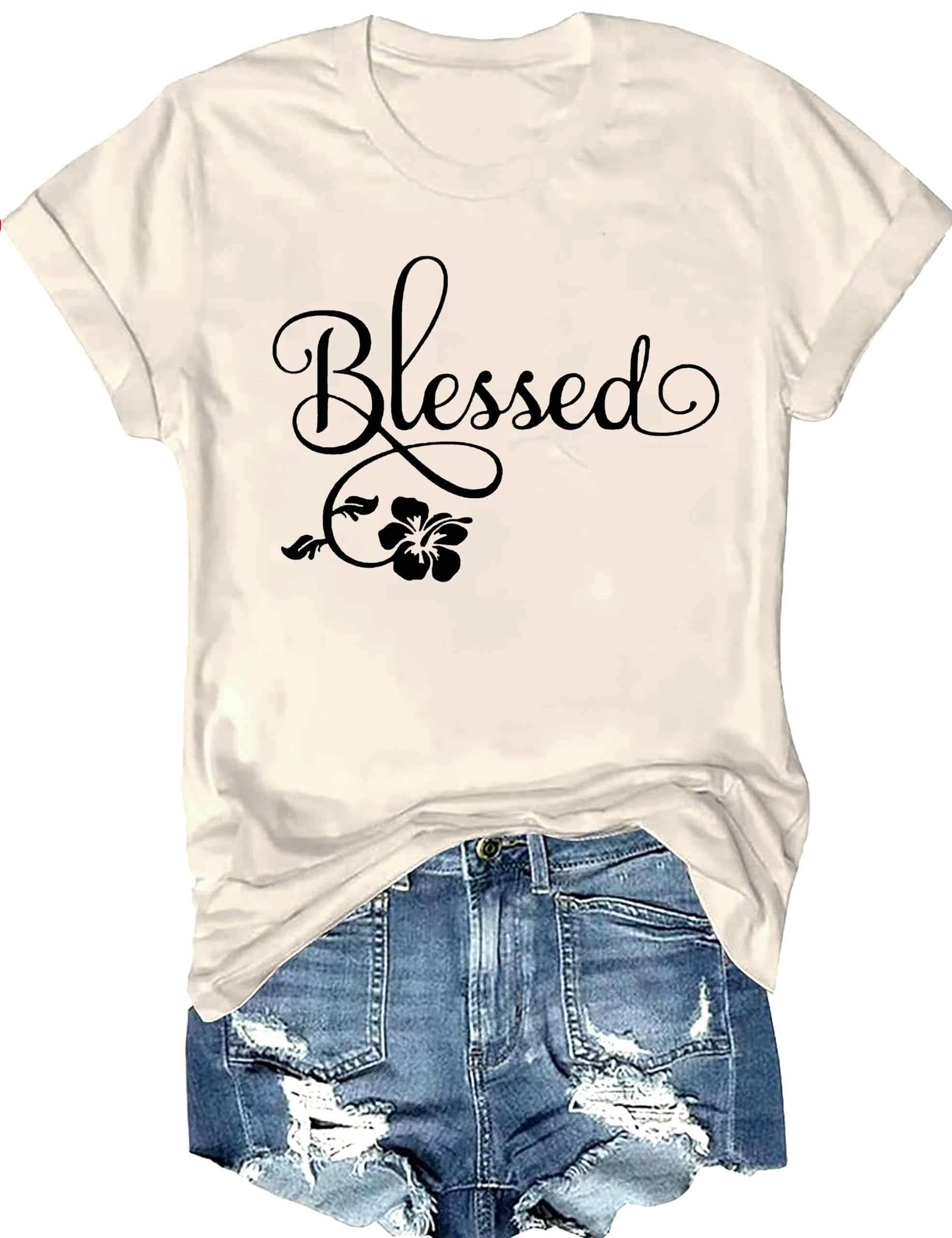 LEVNSD Blessed T-Shirt for Women Cute Sayings Flower Simple Graphic Letter Print Shirts Casual Short Sleeve Thankful Tee Tops|Clothing