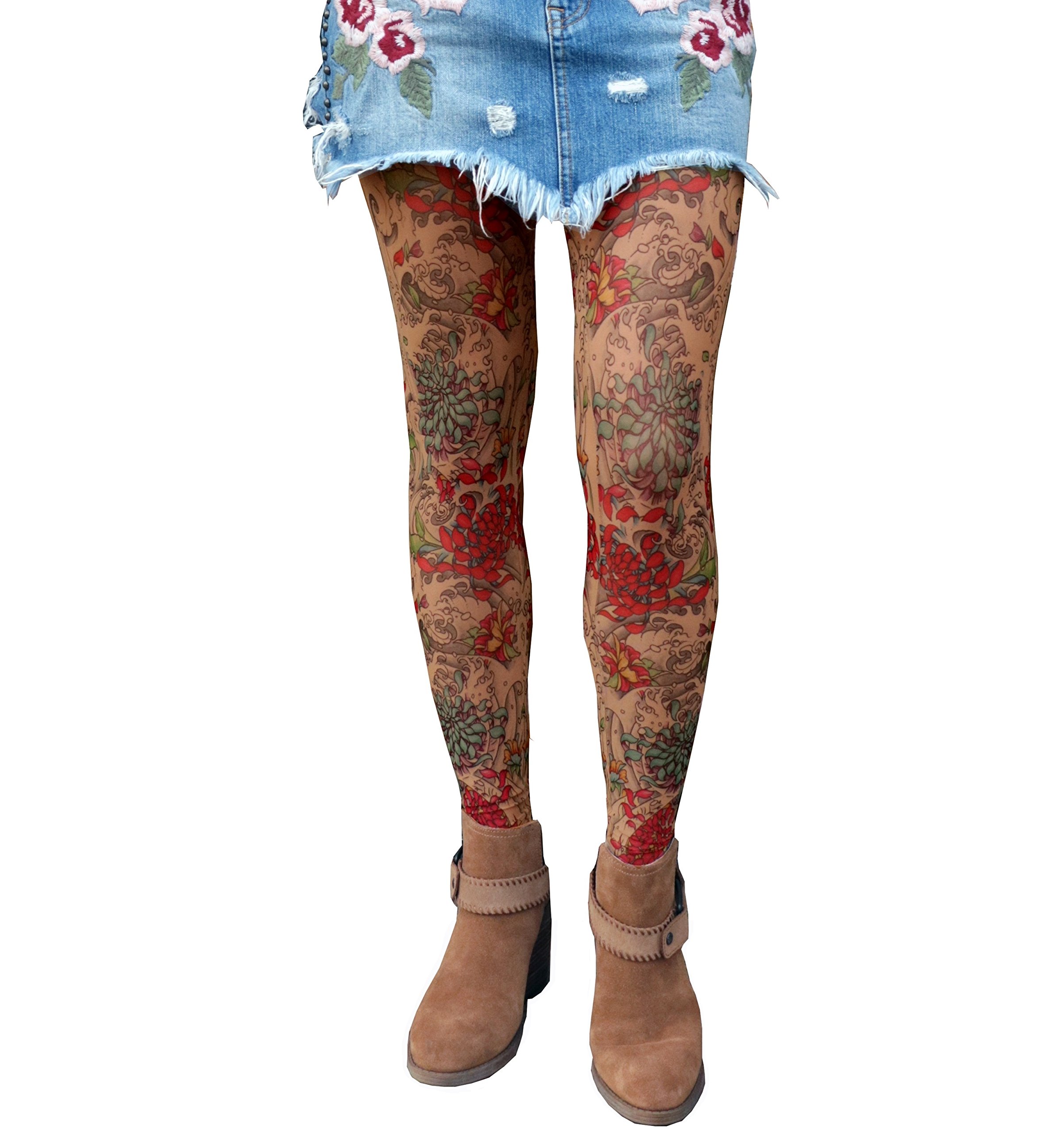 Wild Rose Ladies MUMS Tattoo Mesh Leggings Chrysanthemum Red Flowers, Tan|Clothing