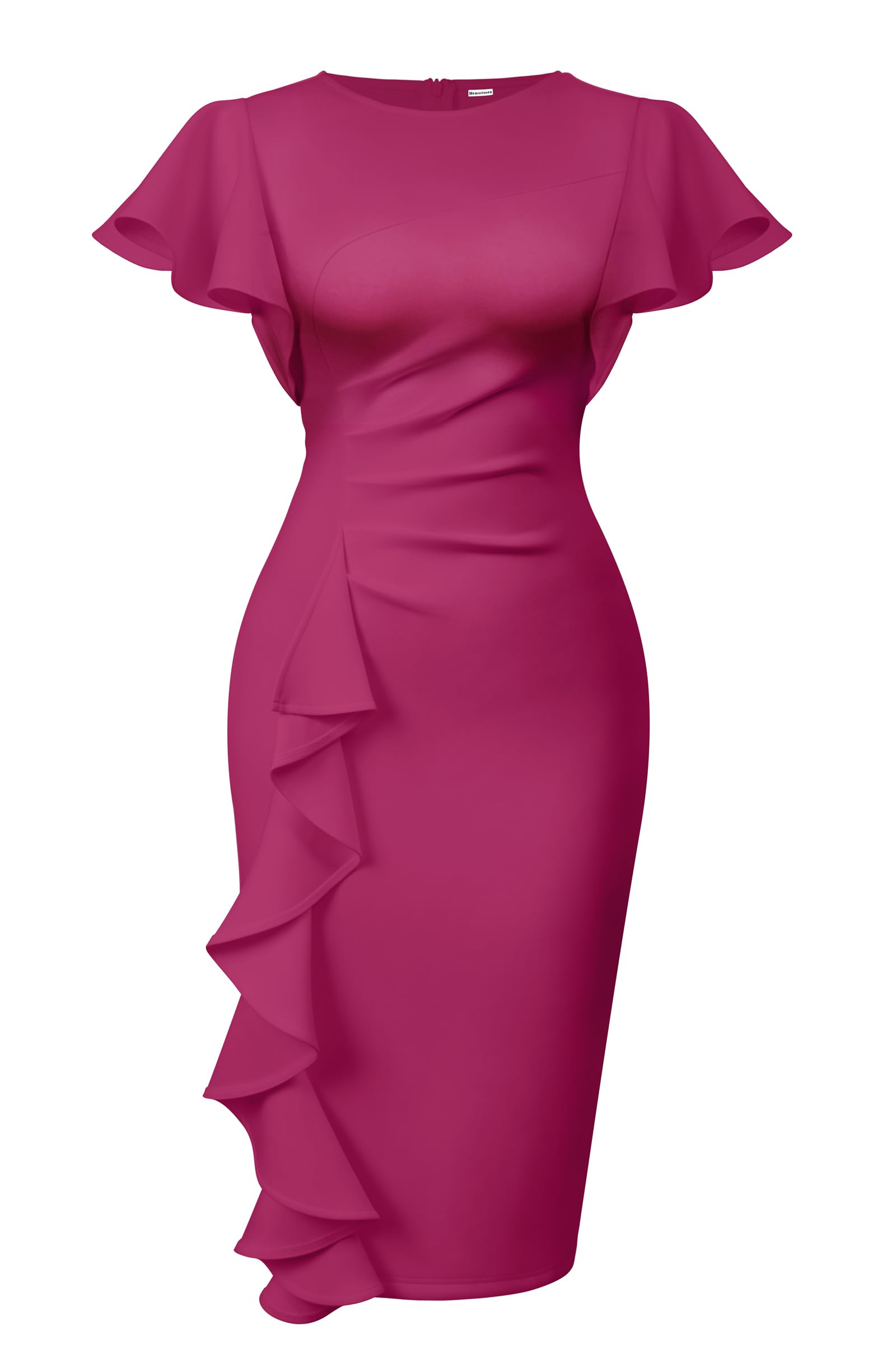 Memoriesea Women's Ruffle Flared Sleeve Bodycon Pencil Formal Cocktail Midi Dress|Clothing