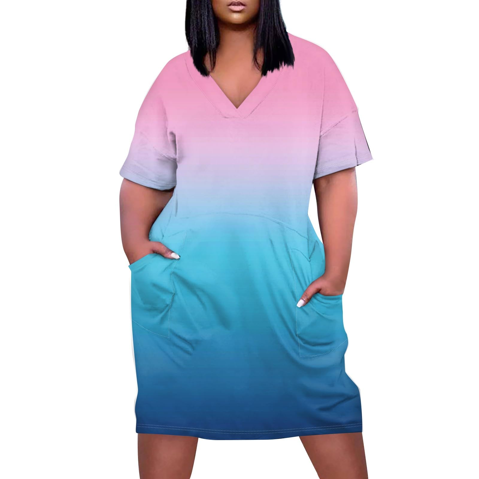 Generic Plus Size Dresses for Curvy Women Oversize T Shirt Midi Dress Loose Short Sleeve V Neck Dress|Clothing