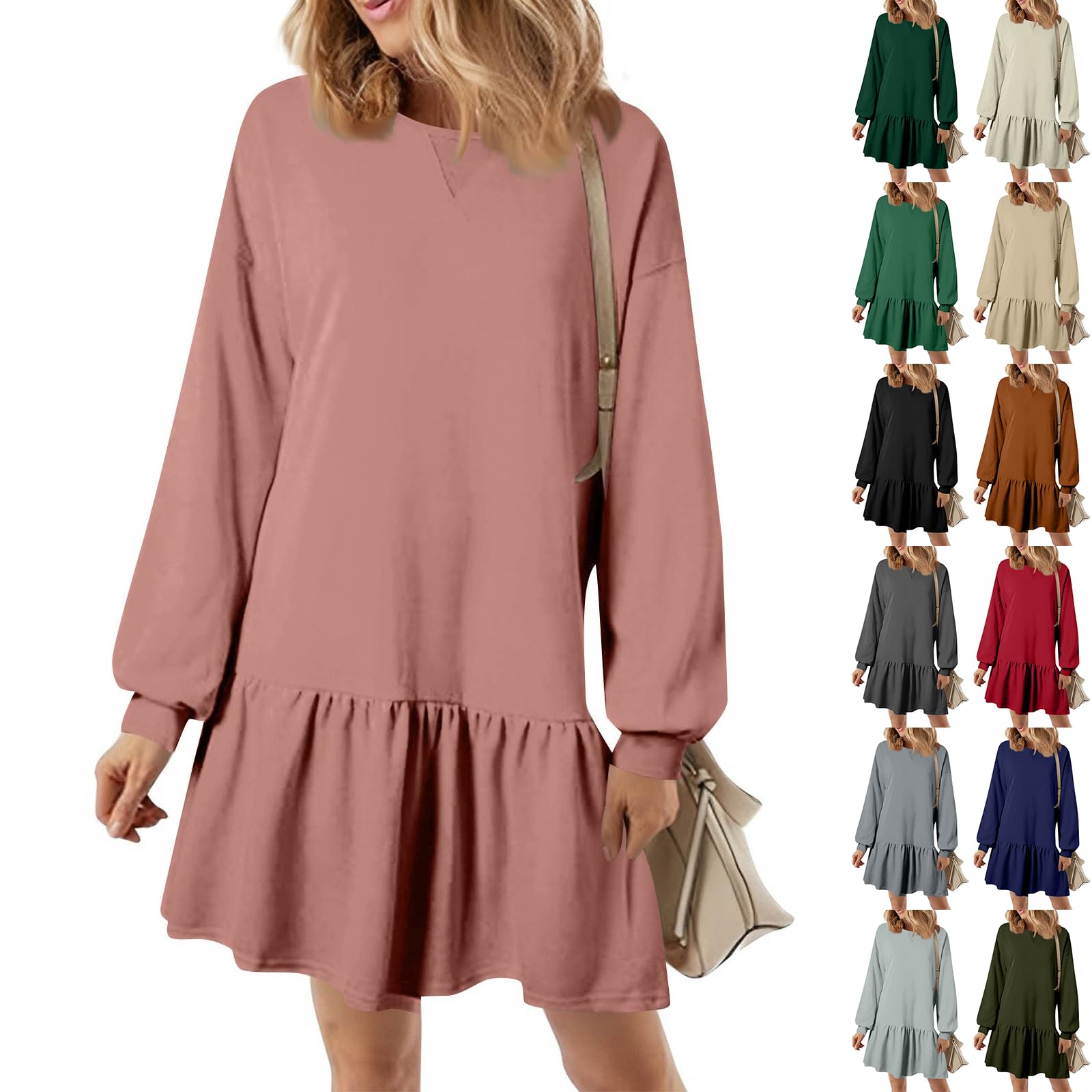Sweatshirt Dress Women Oversized Crewneck Patchwork Babydoll Dress Fall Casual Flowy Ruffle Long Sleeve Mini Dress|Clothing
