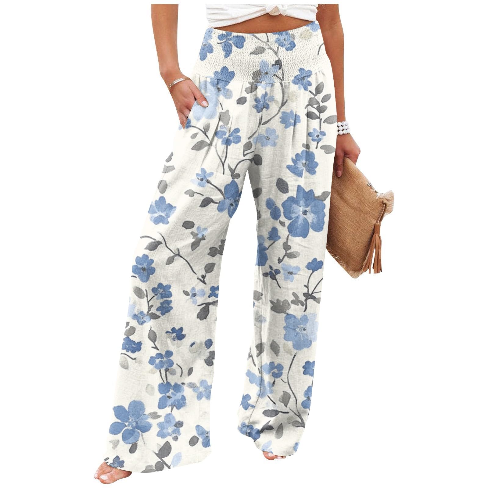 JWNYJFB Cotton Linen Palazzo Pants for Women Boho Floral Wide Leg Trousers Smocked Elastic Waist Beach Pants with Pockets|Clothing