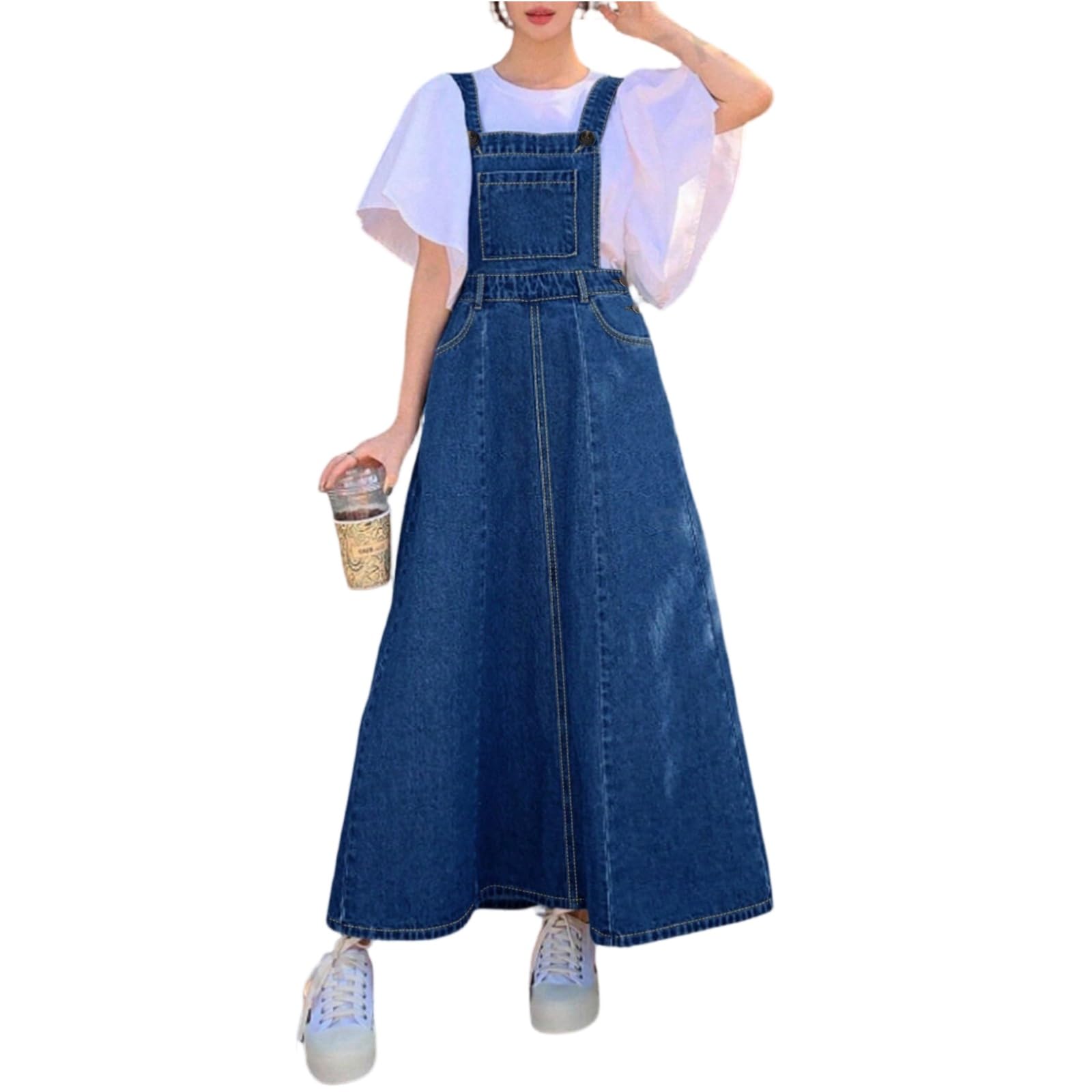 Jumper Dress for Women Pinafore a Line Maxi Jean Dresses Adjustable Spaghetti Strap Denim Overall Dress with Pockets|Clothing