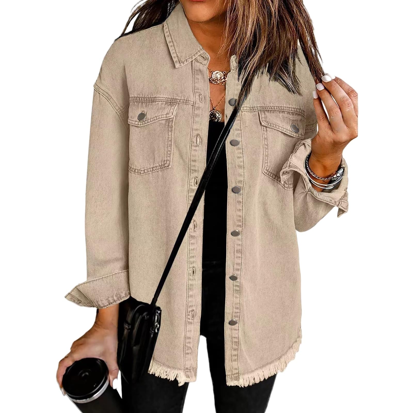 Baxtayel Women's Oversized Denim Jacket Trendy Distressed Frayed Hem Long Sleeve Button Down Shirts Jean Jacket|Clothing