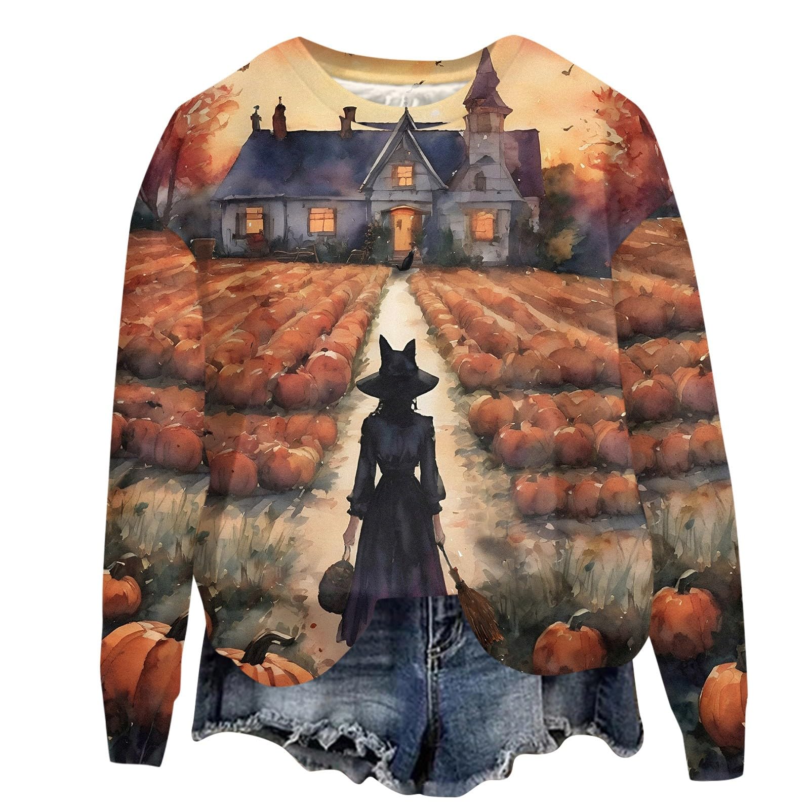HUEAHDOU Witchy Clothes for Women 2025 Fall Casual Long Sleeve Witch Shirt Halloween Witch Graphic Crewneck Sweatshirts|Clothing