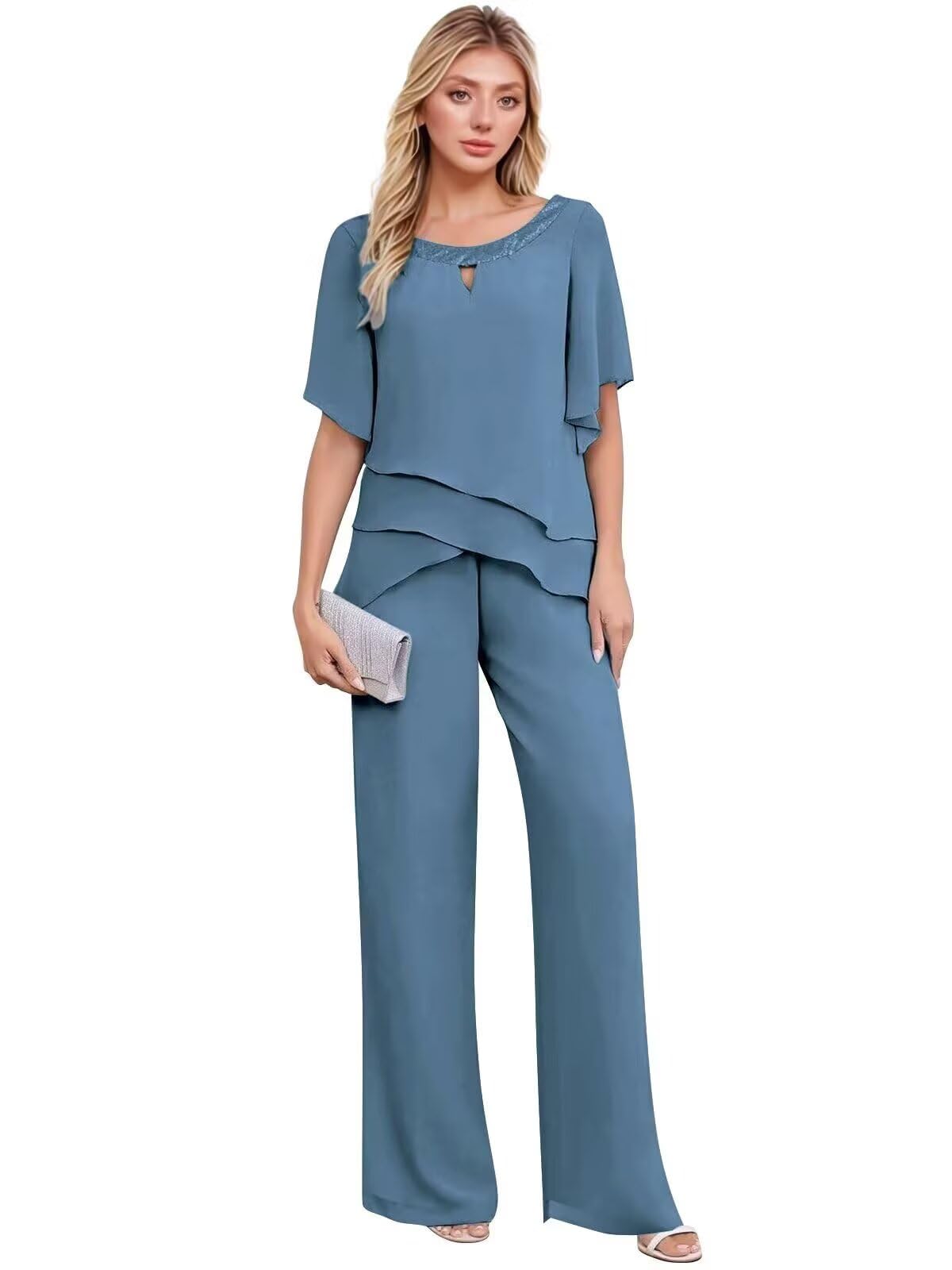 Womens Dressy Pantsuits for Evening Wear Steel Blue 2 Pieces Jumpsuits Chiffon Half Sleeve Mother of The Groom Dresses for Wedding US16|Clothing