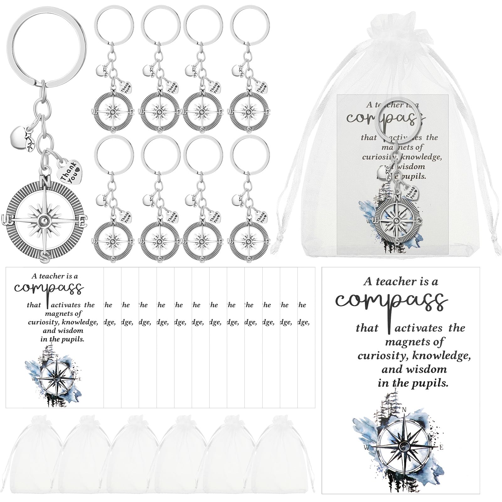 Ferreve Teacher Appreciation Gifts in Bulk Compass Keychain Set with Thank You Cards and Organza Bags End of Year|Clothing