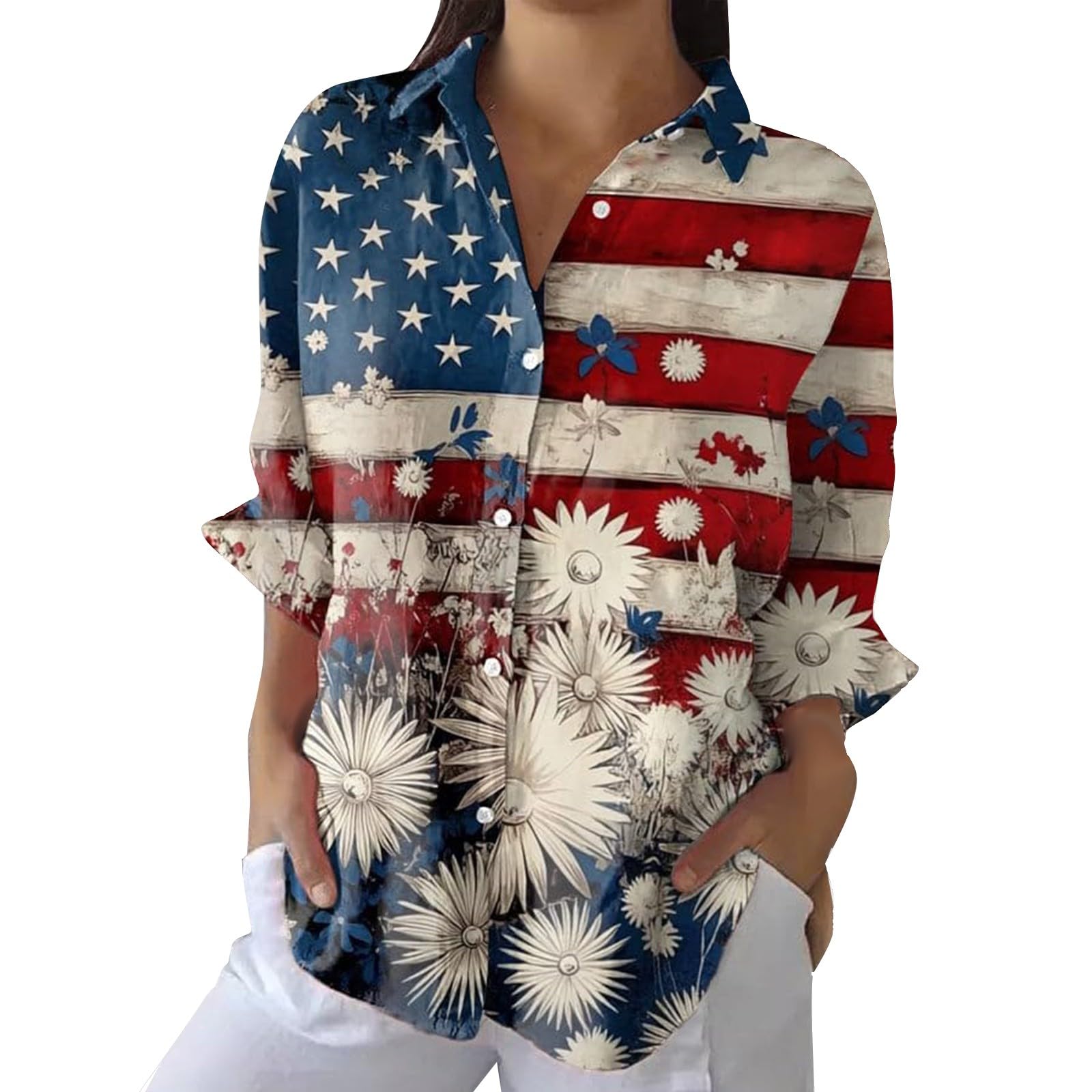 Women's Cotton and Linen Independence Day American Flag Floral Print Shirt 4Th of July Button Down Shirts for Women|Clothing