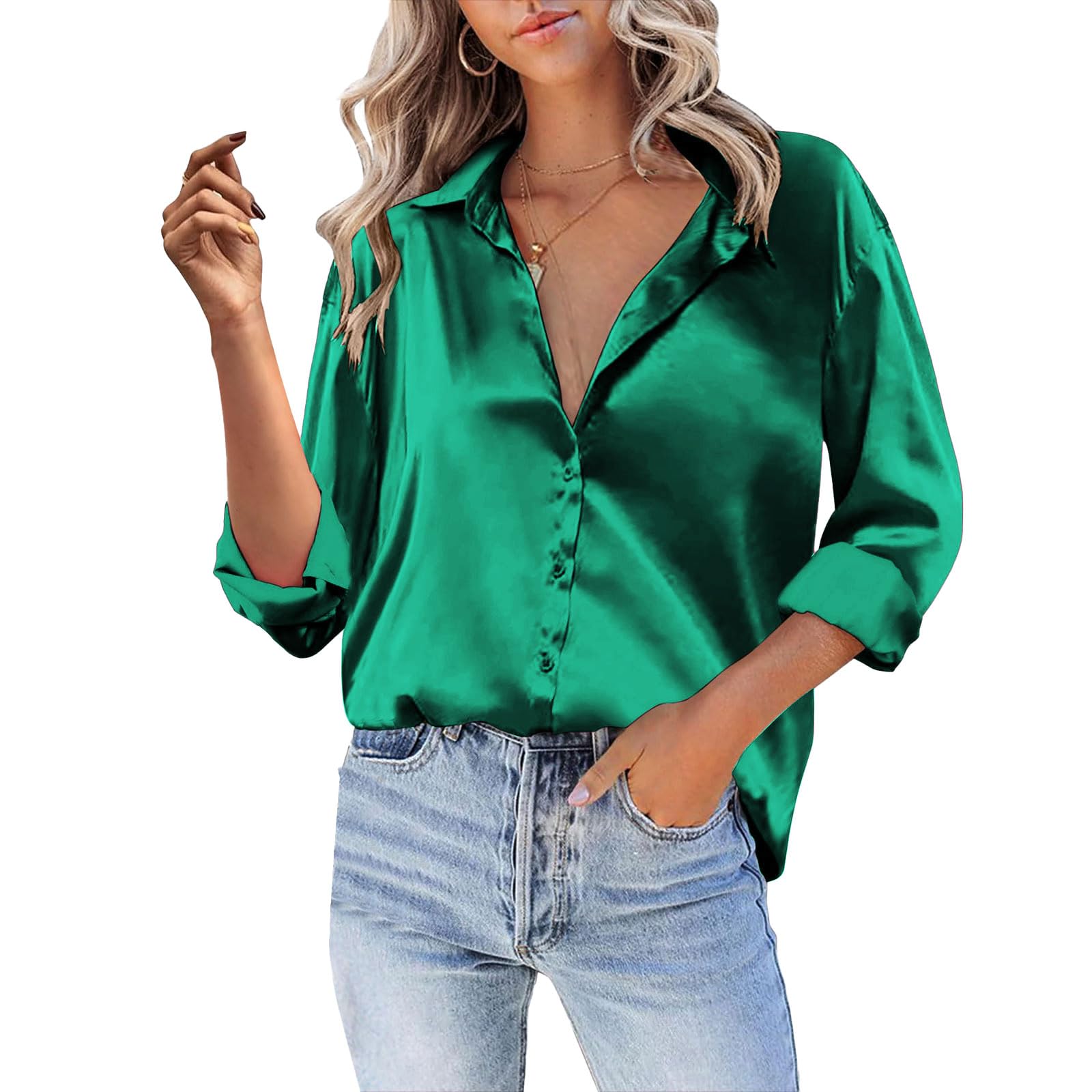Baxtayel Women Satin Silk Button Down Shirt Casual Long Sleeve V Neck Blouse Loose Dressy Business Work Office Tunic Tops|Clothing