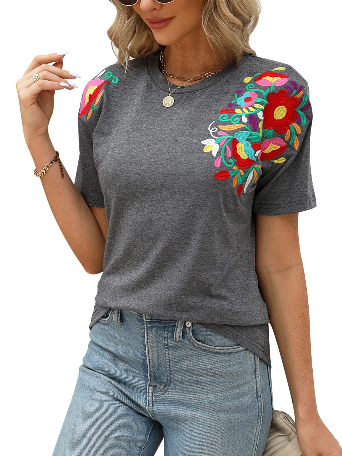 Vackutliv Mexican Shirts for Women Embroidered Tops Traditional Summer Blouse Women's Floral Tunic Round Neck Short Sleeve|Clothing