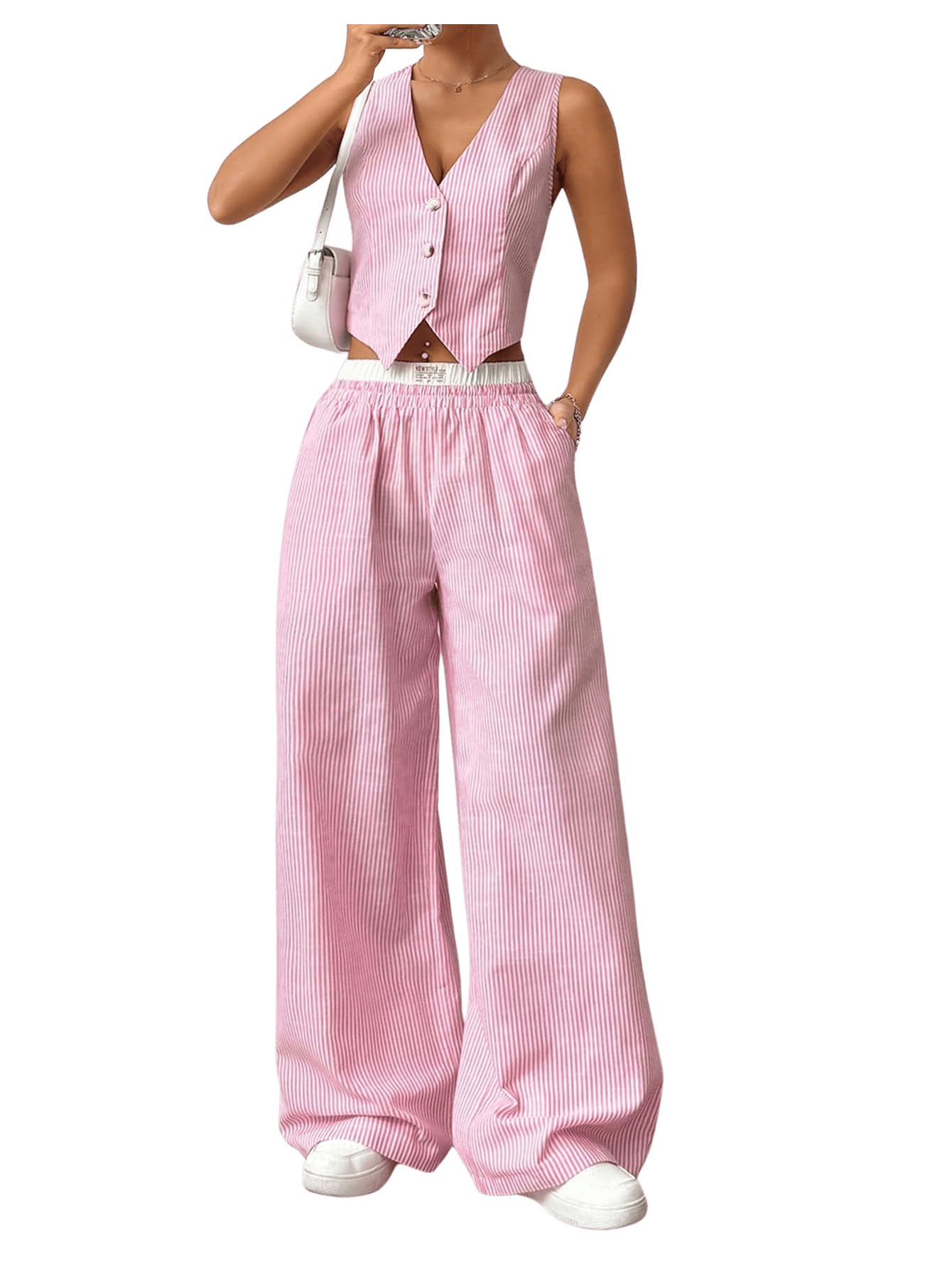 Milumia Women's 2 Pcs Outfits Striped V Neck Button Blazer Vest Pants Tracksuit|Clothing