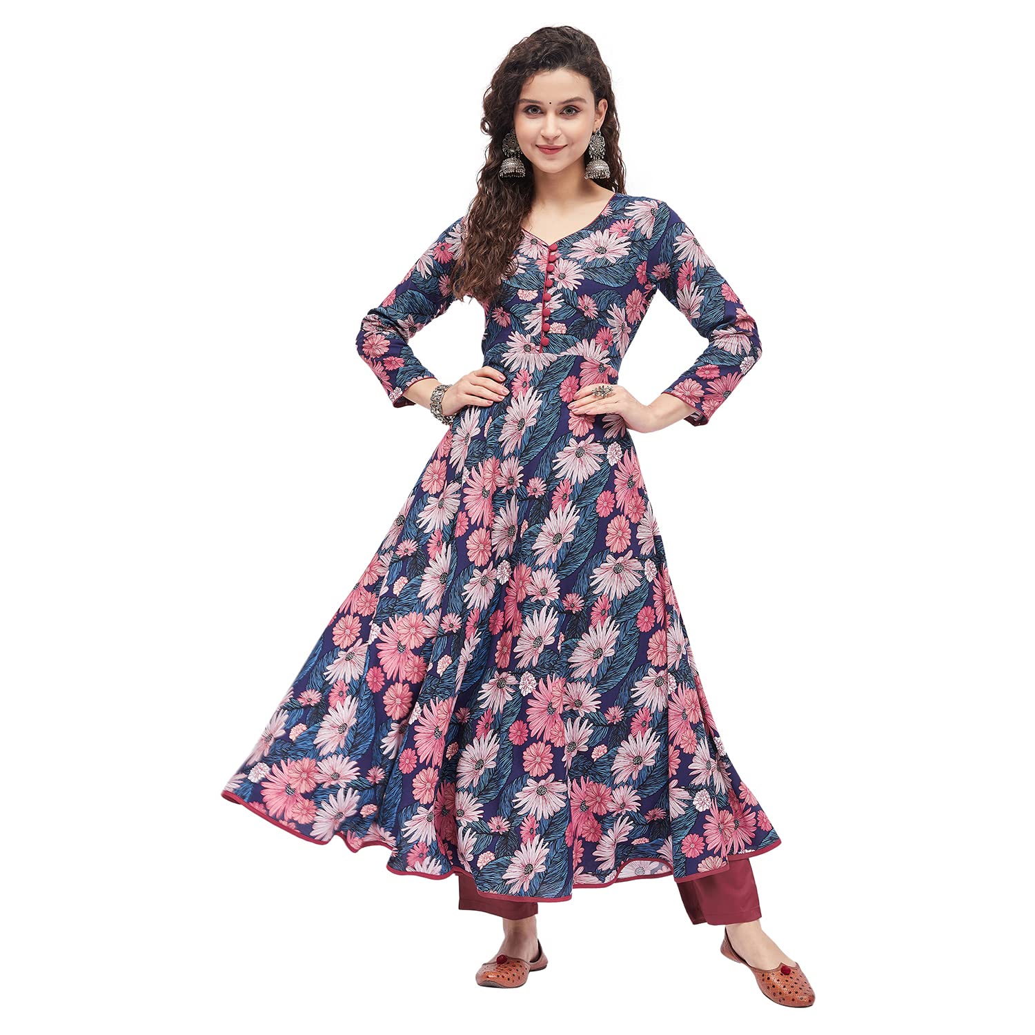 Tissu Women's Rayon Blue & Pink Floral Printed A-Line Kurta|Clothing