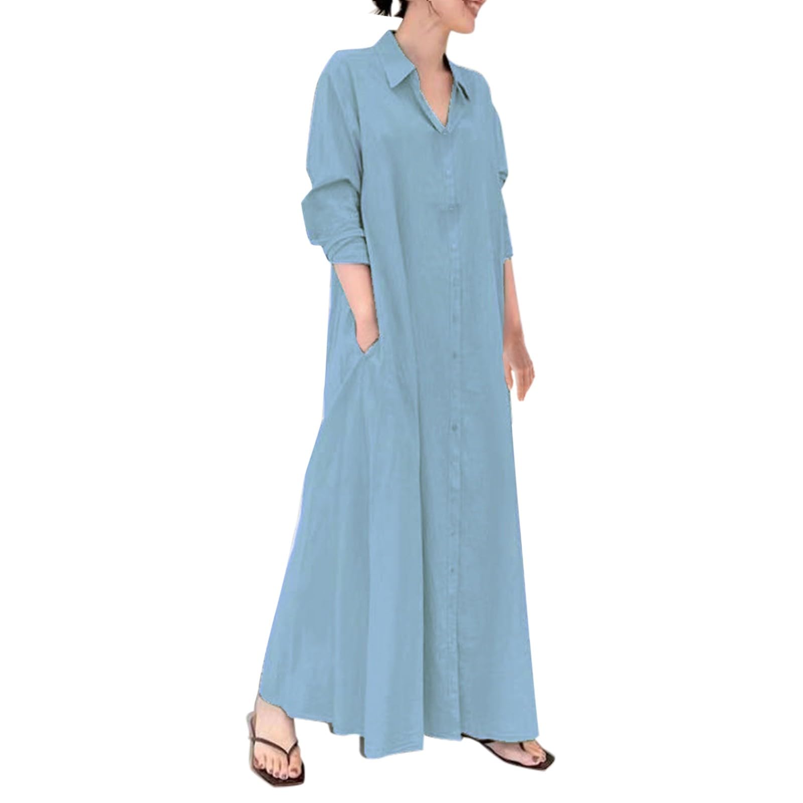 Caftans Dresses for Women Gauze Maxi Botton Dowm Long Sleeve Shirt Dress Lapel Fall Causal Loose Dress with Pockets|Clothing
